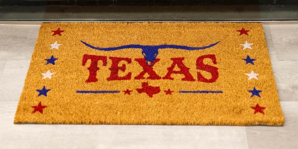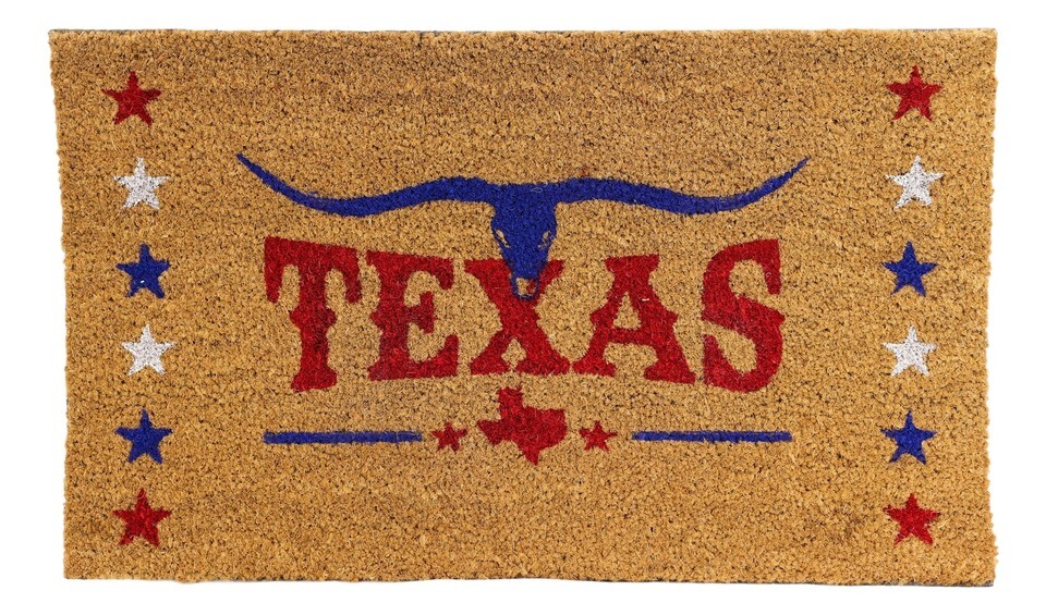 ? Showcase your patriotism and Texas pride with this rustic floor mat featuring a blue longhorn skull with the words TEXAS underneath. The sides of the mat is bordered by white blue and red Western Lone Stars.