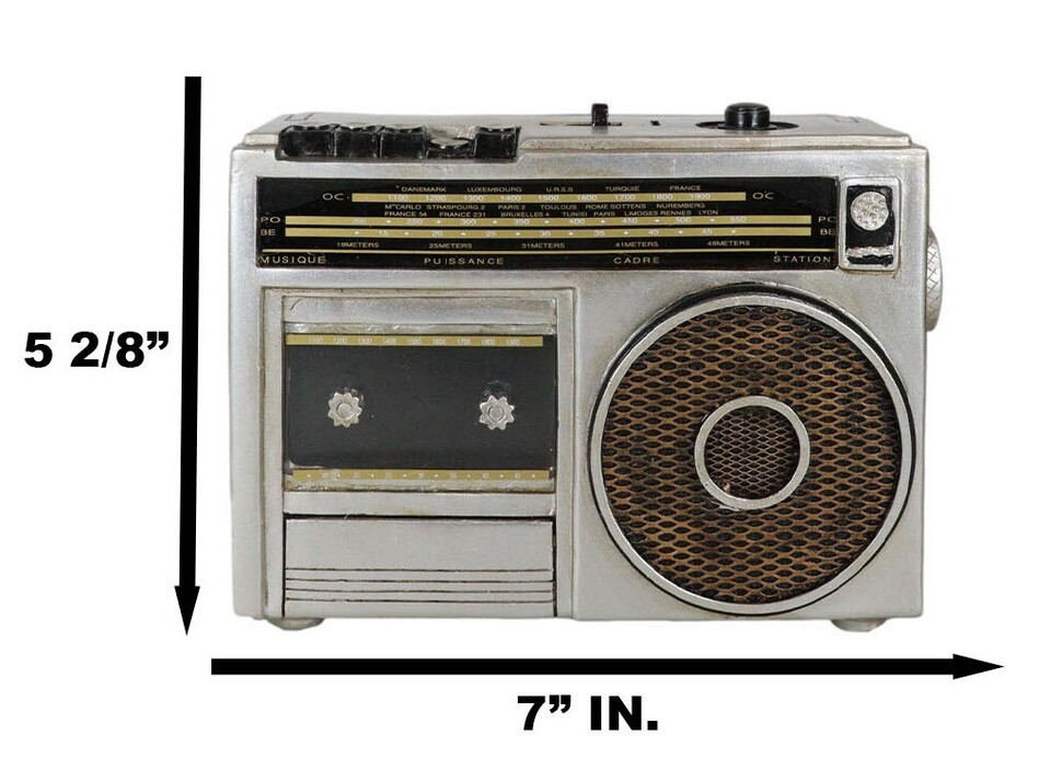 ? Bring a little touch of the oldies to your living room or office with this retro Cassette Player Radio money bank. Whether you use it as a vintage decorative accent or as a money bank itself, this sculpture will bring nostalgia to all. Insert coins into the strip slot on the sculpture and access your savings by removing the rubber stopper 'plug' beneath the sculpture.