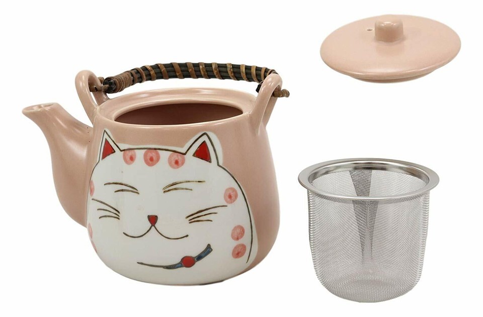 ? This Maneki Neko ceramic tea pot set serves four people, containing 1 teapot(20oz) with strainer and wooden handle, 4 tea cups packaged in a set box.