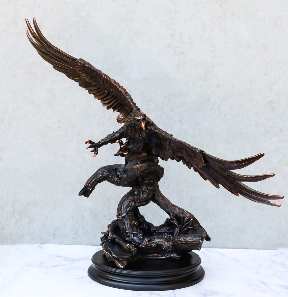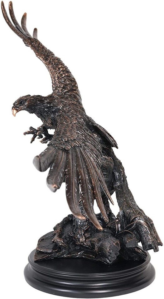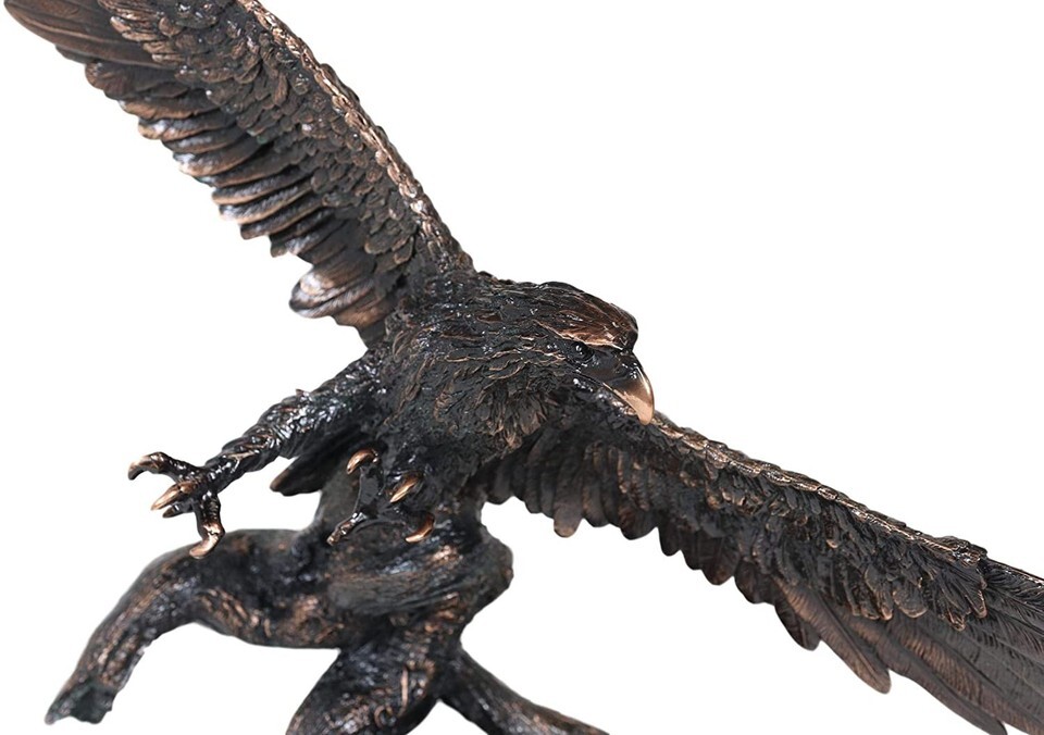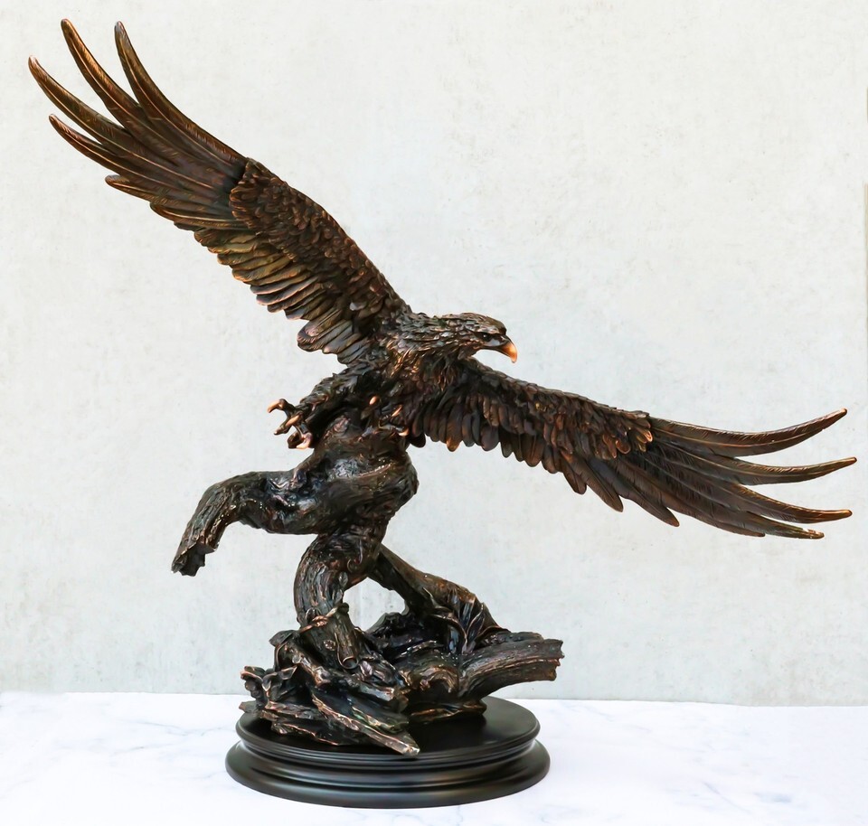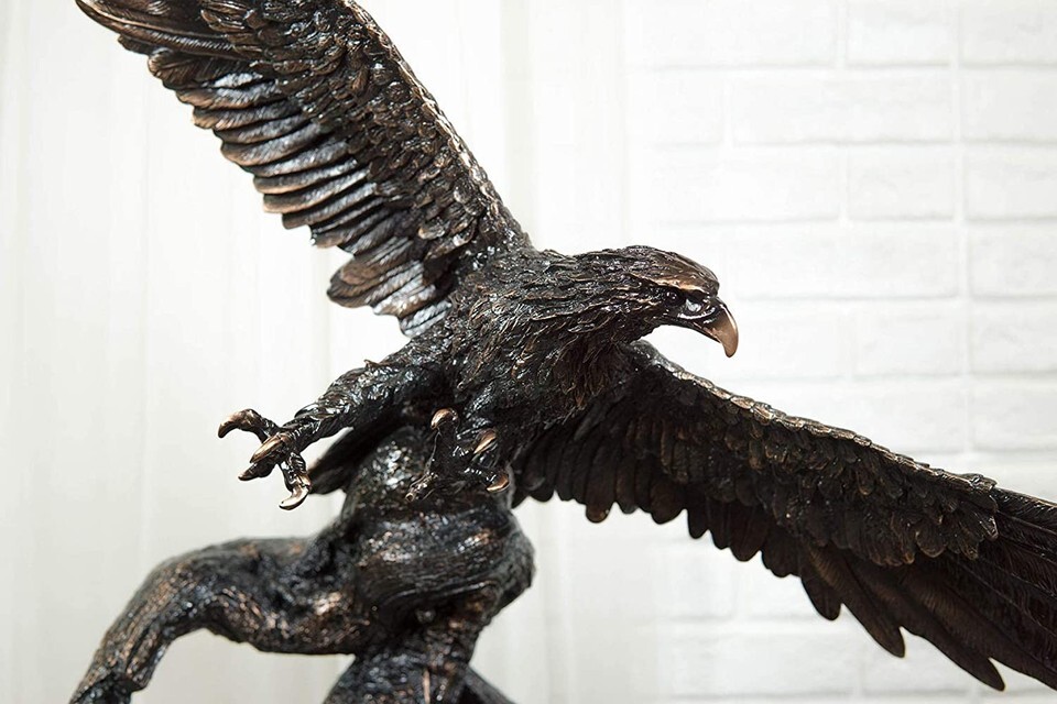? This Majestic Bald Eagle Statue is made of the highest quality resin, undergoing the process of bronze electroplating giving it a uniform shine on the inside as well as the surface of the figurine. To add sculptural aesthetics and display worthiness, we add accent black wooden base to the sculpture.