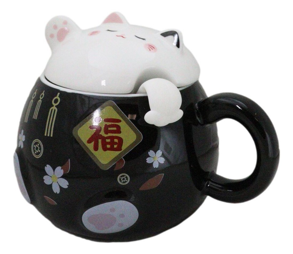 Black Maneki Neko Beckoning Lucky Cat Mug Cup With Kitty Lid And Stirring Spoon