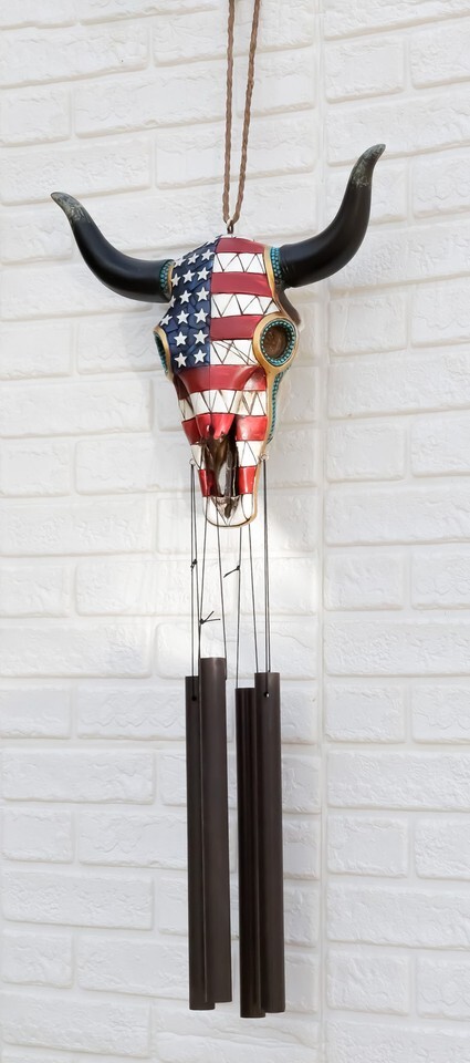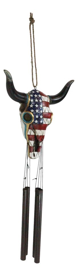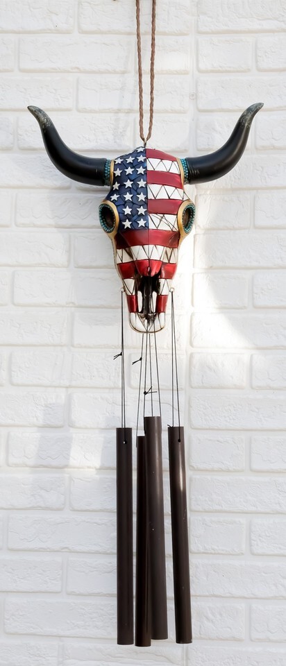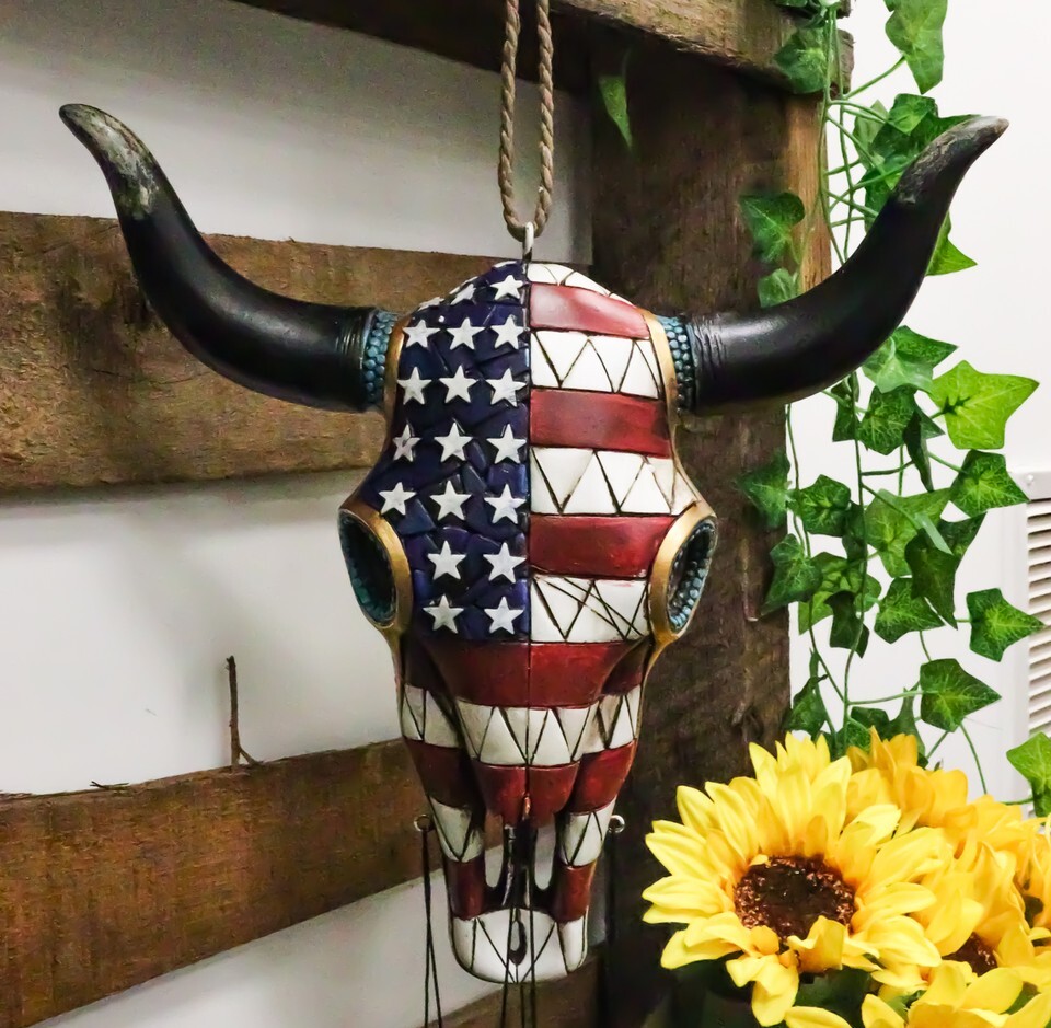 Ebros Large Rustic Western Patriotic Bull Cow Skull With US Flag Decorative Wind Chime