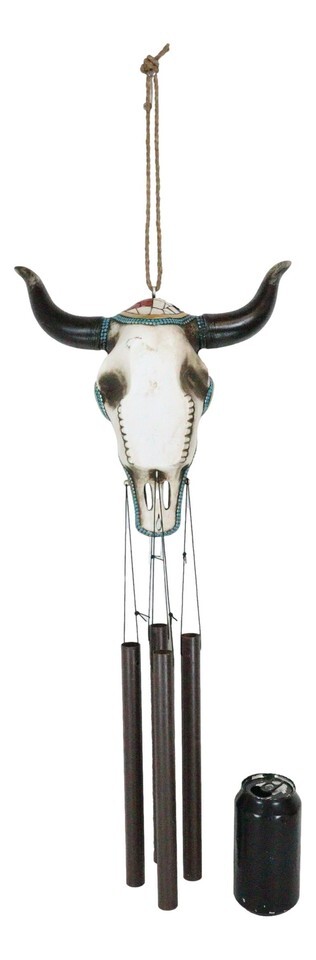 ? This Patriotic American Flag Cow Skull Wind Chime is made of resin and painted aluminum, hand painted and polished.