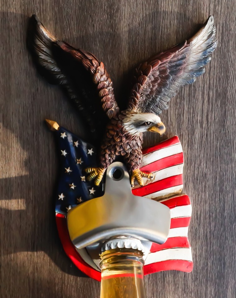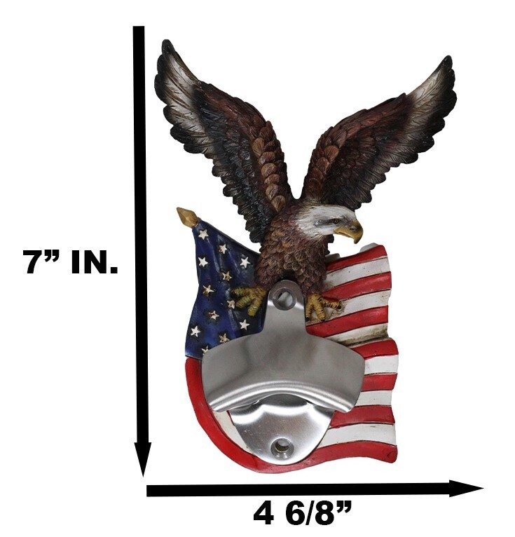? The stylish Eagle With US Flag Bottle Opener transforms a mundane and basic utility item into a patriotic and cool way to easily remove the cap from any bottle. The stainless steel metal opener hardware makes a great and useful home tool for your party in your home or man cave.