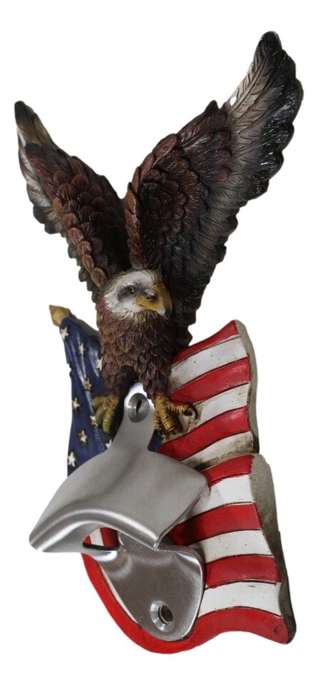 ? This Patriotic Eagle Wall Bottle Opener is made of polyresin, hand painted and polished individually.