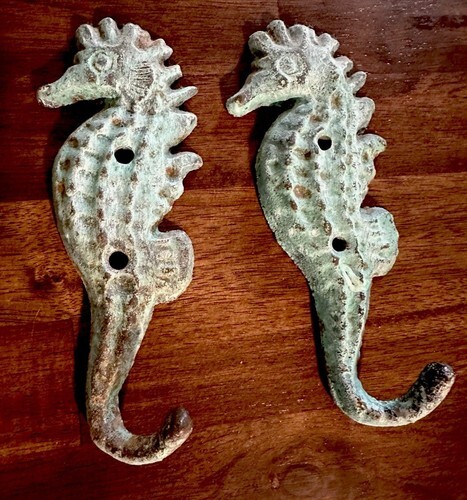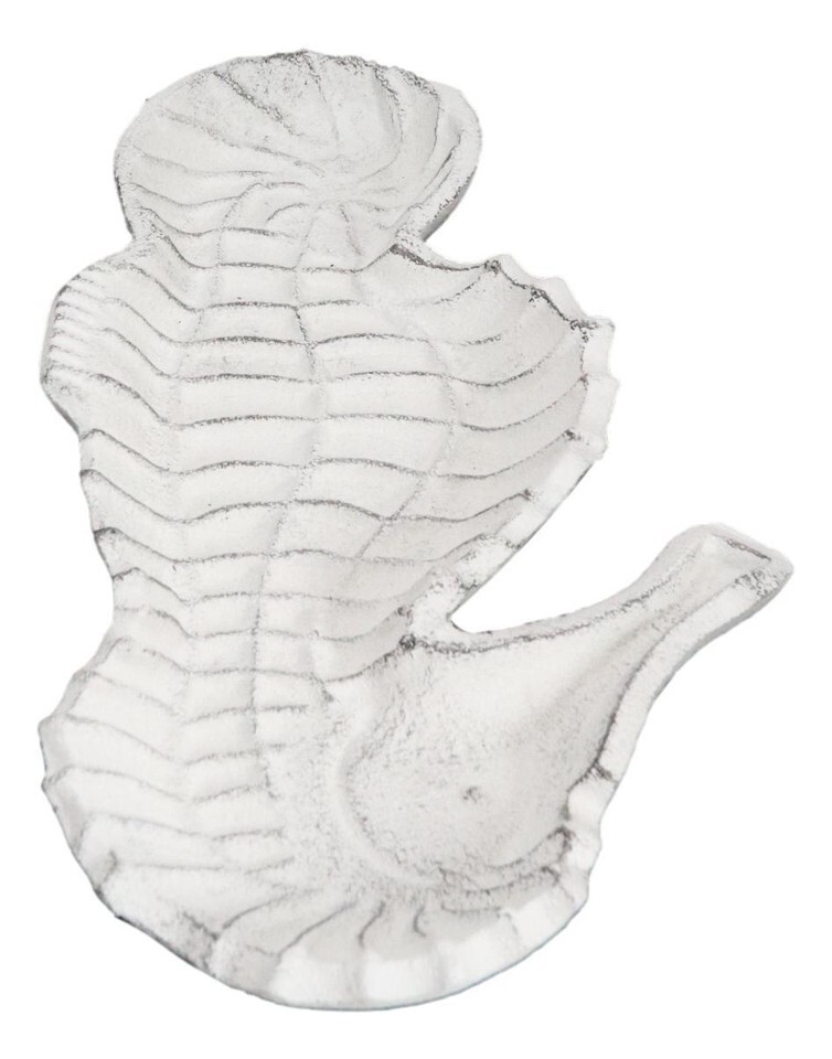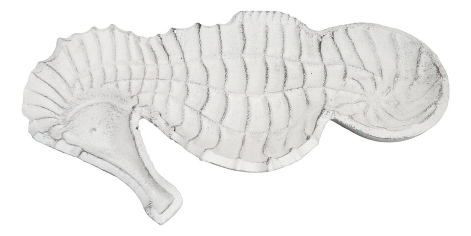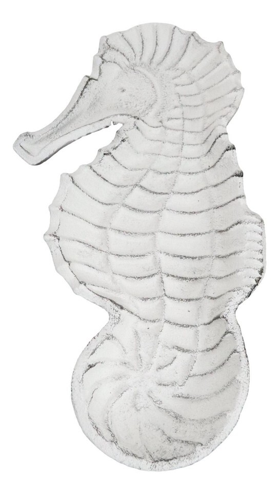 ? This Whimsical Seahorse Tray Or Dish is made of rustic cast iron, hand crafted and painted individually to a whitewashed finish.