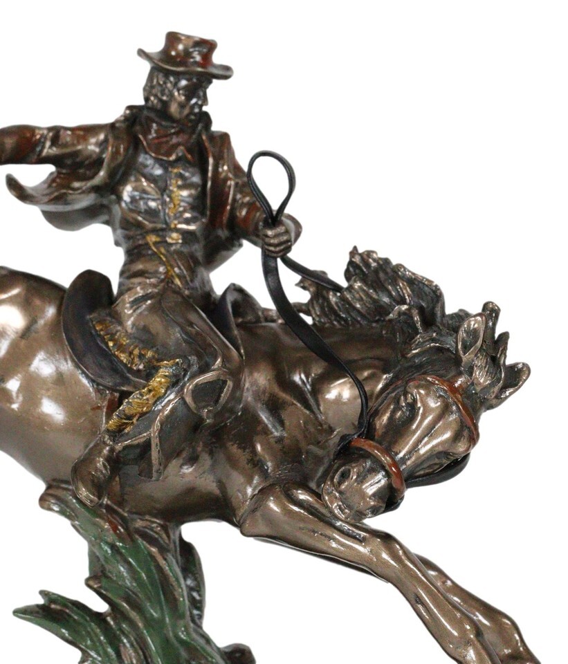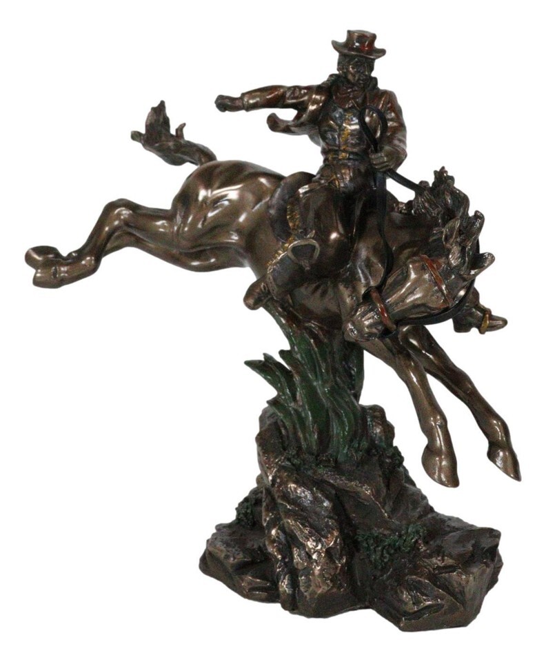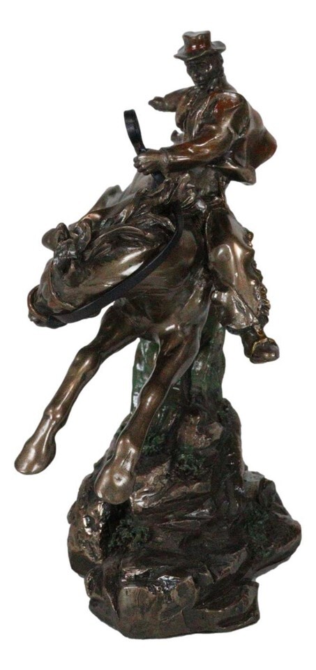 ? This Cowboy On Running Horse Figurine is a dramatic work of sculptural art that is a true statement piece for your home gallery, paying homage to the larger-than-life characters of the Old West. It features a rodeo cowboy riding on a wild galloping horse. Finished in faux bronze color, the sculpture will add rustic charm to any room you set him in.