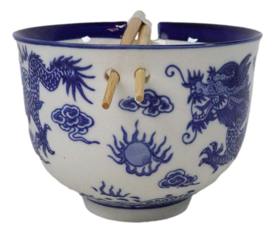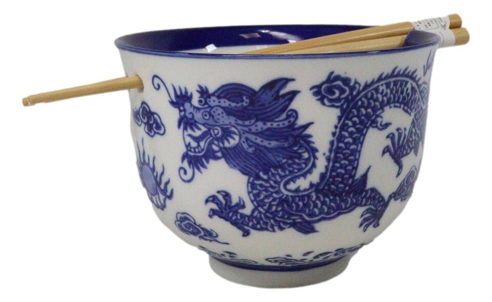 Blue White Oriental Dragon King Ceramic Donburi Ramen Bowl With Chopsticks Set