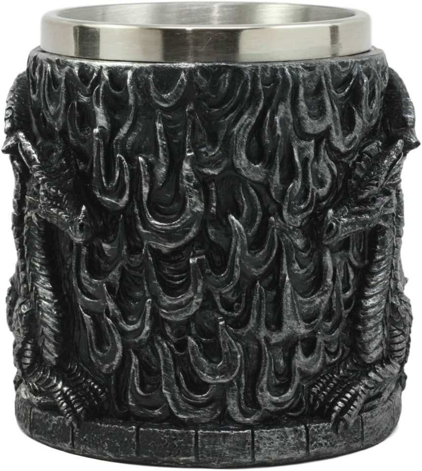 ? This Alchemy Potion Dragon Fire Mug is perfect for your medieval/renaissance themed parties! It is designed for Game Of Thrones, Might and Magic Gaming and other fantasy sequel fans. Imagine drinking out of this mug with your beer buddies, close relatives or what have you! Made of high quality polyresin, hand painted and polished, this mug is topped with a stainless steel liner for safe drinking.