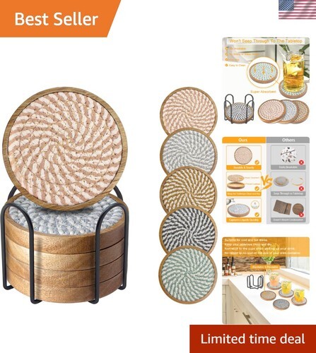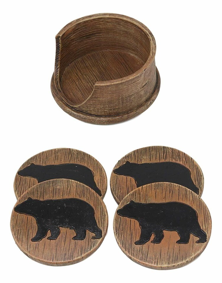 Faux Wood Rustic Forest Black Bear Coaster Holder With 4 Round Coasters Set