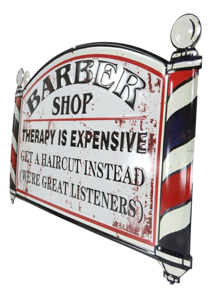 ? This iconic sign says it all folks! Therapy is expensive and so just get a haircut! Sized at about 23" Wide, you can't miss this sign on your wall!