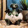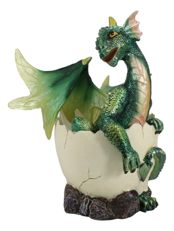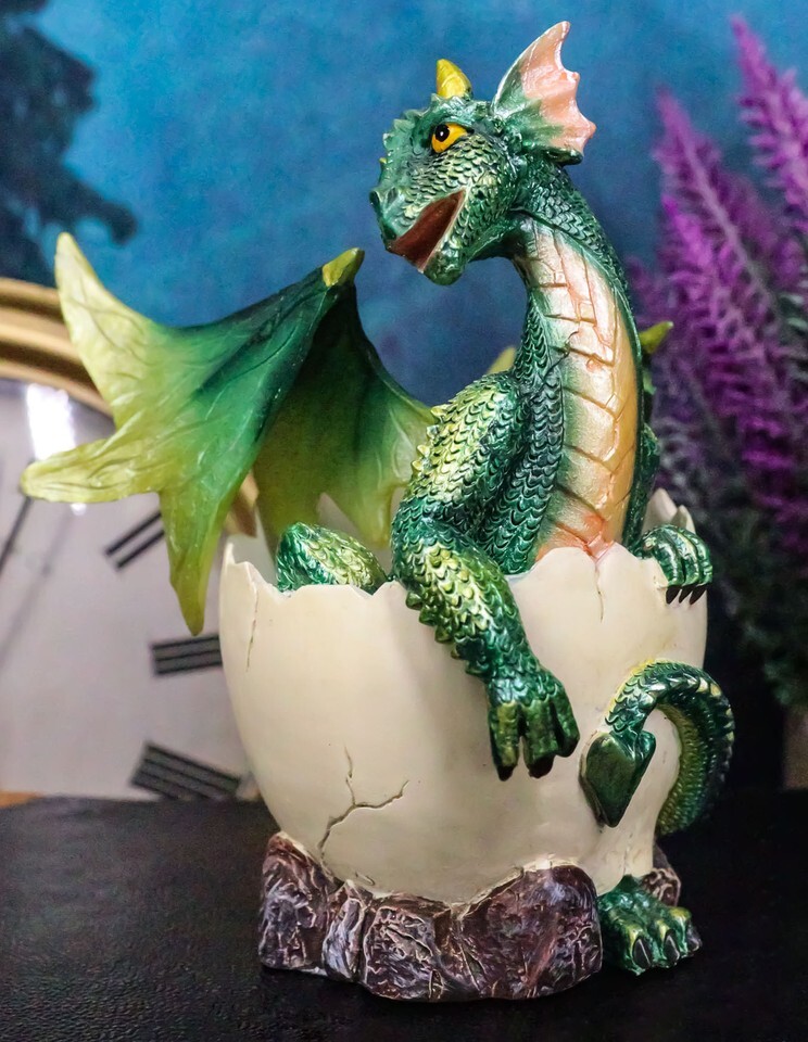 ? This Whimsical Small Green Winged Baby Dragon In Egg Figurine is made of polyresin, hand painted and polished individually.