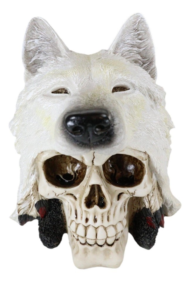 ? This Lone Wolf Indian Warrior Skull Statue is a gothic depiction of a brave indian chieftain warrior. This Lone Wolf warrior wears a white snow wolf hat with symbolic feathers indicating the number of successful conquests he has undertaken. It is an exotic skull to collect and gift away!