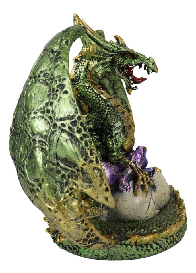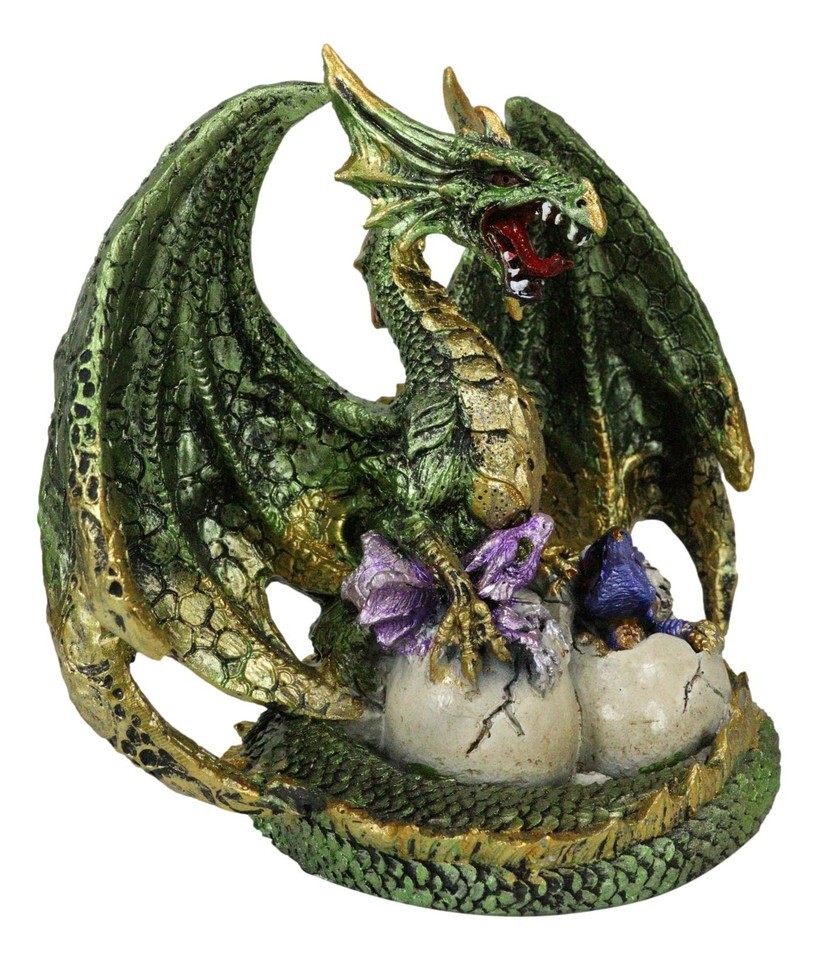 Ebros Metallic Green Gold Terra Mother Dragon Guarding 2 Wyrmlings In Eggs Figurine