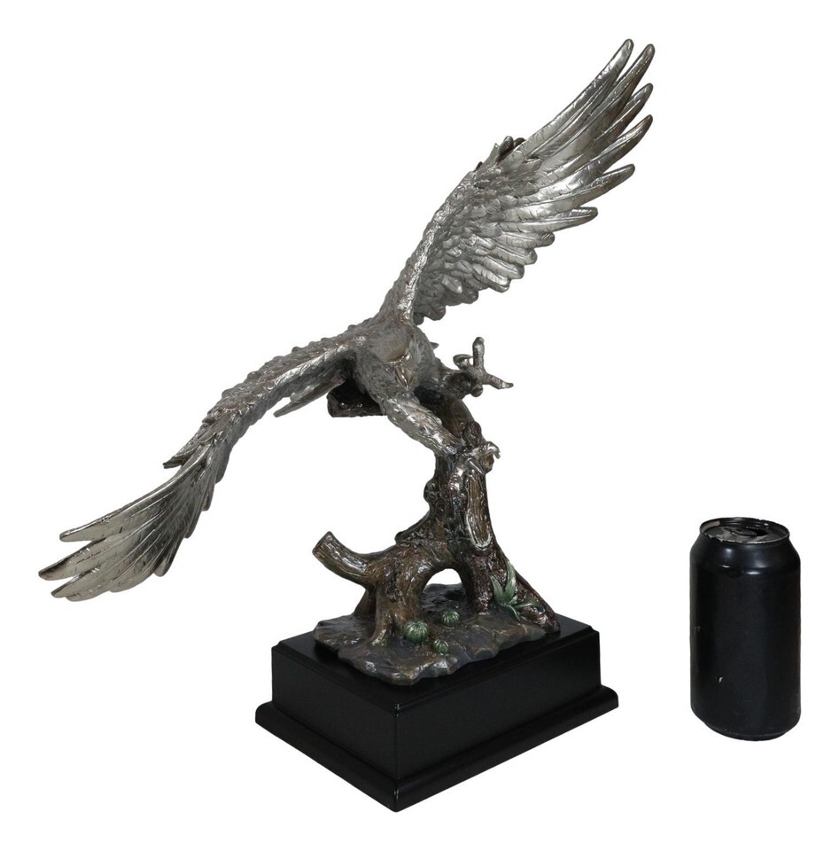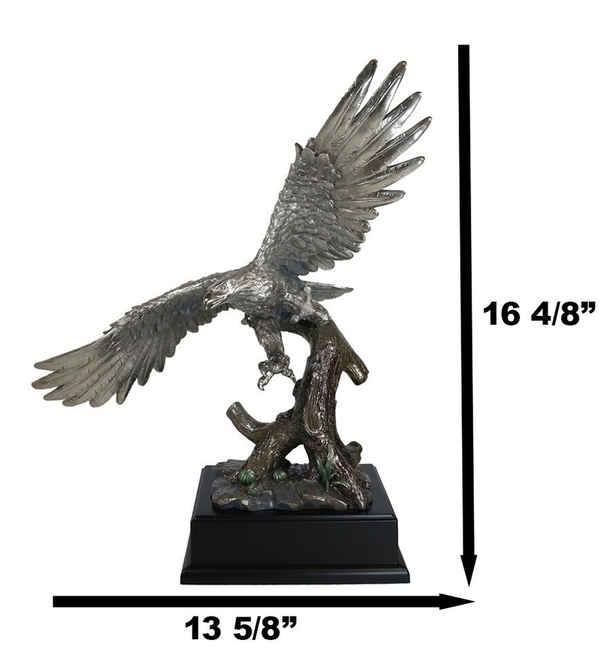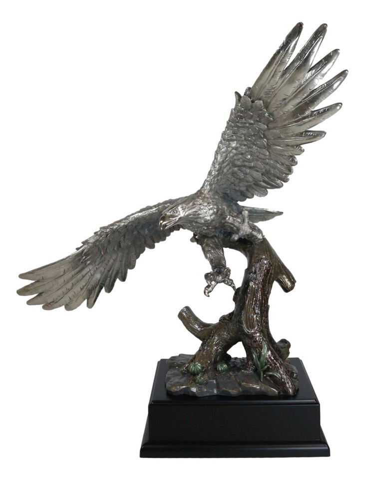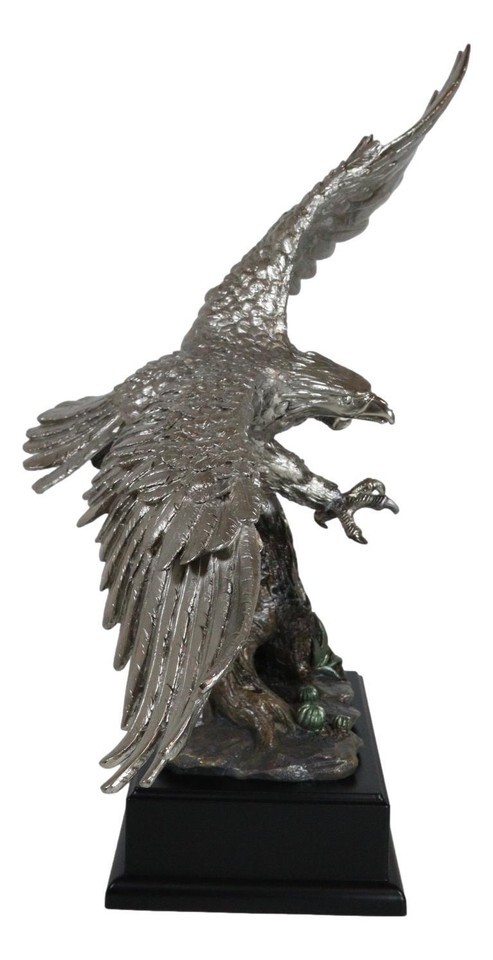 ? This Majestic Bald Eagle Statue is made of the highest quality resin, undergoing the process of silver electroplating giving it a uniform shine on the inside as well as the surface of the figurine. To add sculptural aesthetics and display worthiness, we add accent black wooden base to the sculpture.