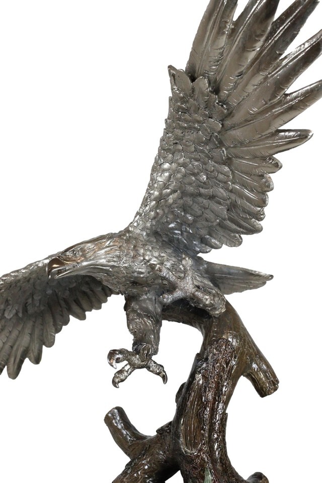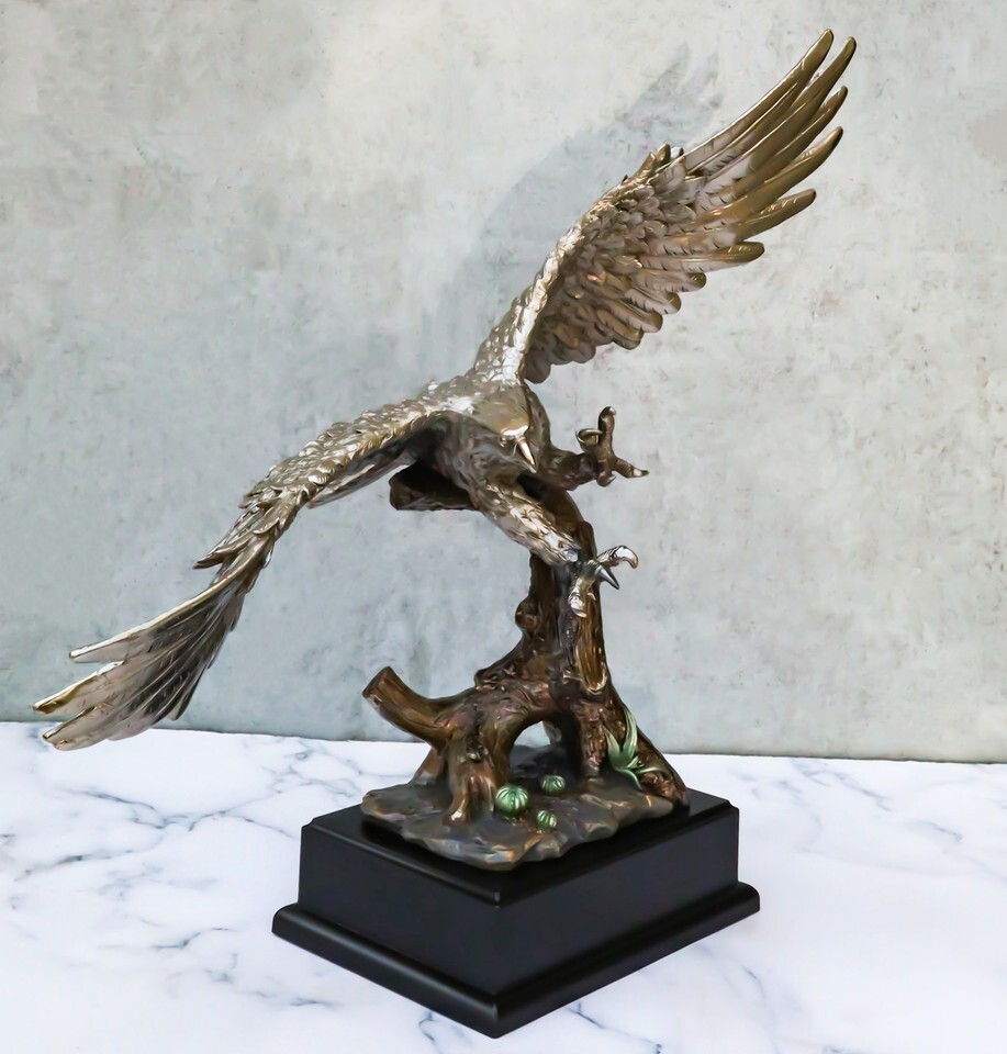 ? A mighty bald eagle spreads out its wings wide and soars over the tree top. Impressively designed and sculpted in 360 degree mold, the sculpture is stunning to behold!