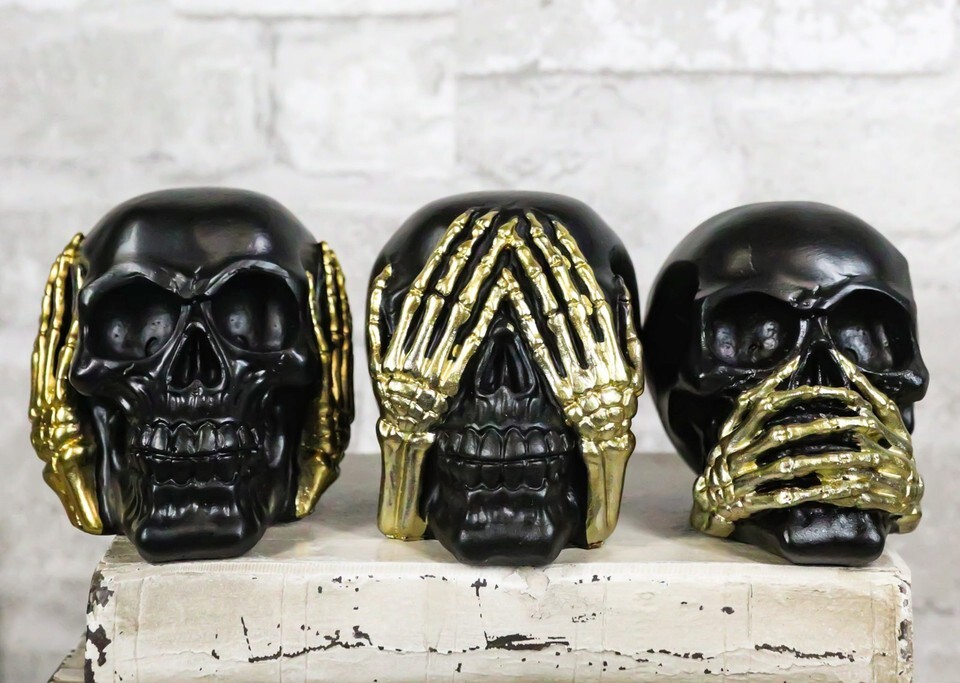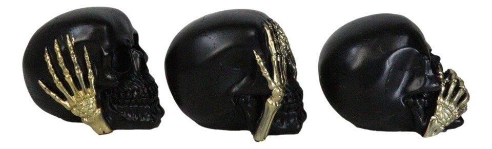 Set Of 3 Gothic Black See Hear Speak No Evil Skulls Golden Hands 3"H Figurines