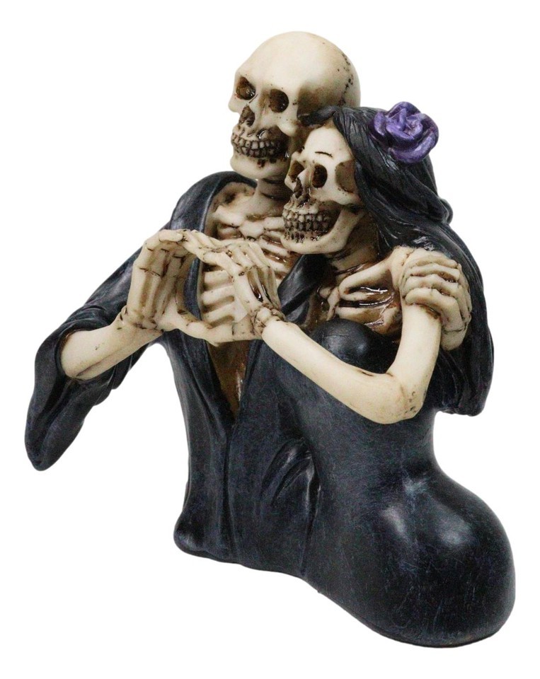 ? This Love Never Dies Skeleton Couple figurine is made of designer composite resin, hand painted and polished individually. Color Tone may vary