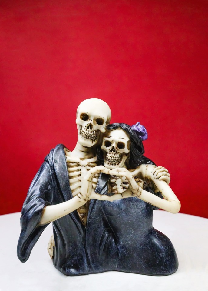? Celebrate eternal devotion with the Love Never Dies Skeleton Couple Figurine. Cloaked in flowing black robes, this skeletal pair shares a tender moment, forming a loving heart sign together with their skeletal hands. Blending gothic romance with macabre artistry, this figurine makes a striking display for Halloween, gothic decor, or as a unique gift for couples who embrace the darker side of love. A hauntingly beautiful reminder that true love lasts beyond a lifetime.