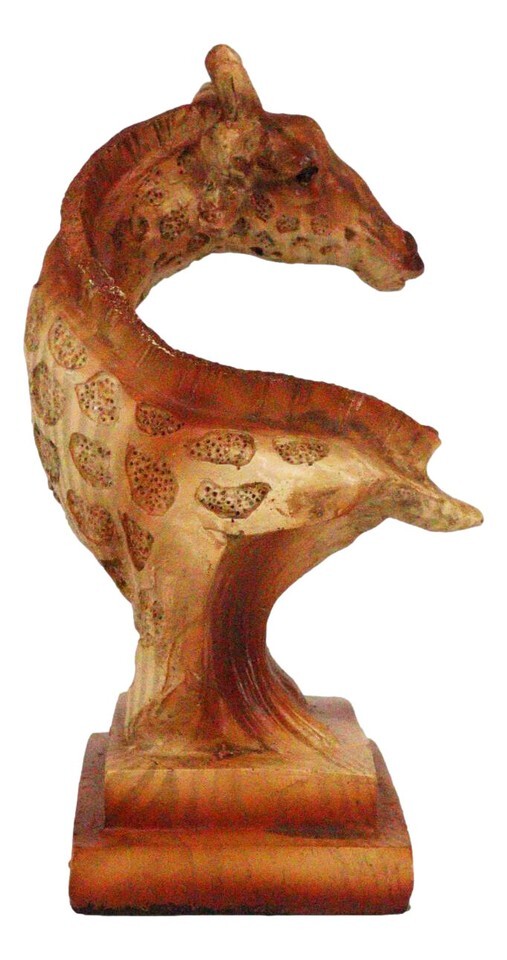 ? This giraffe sculpture is made of designer composite resin, hand painted and polished to resemble wood cutout carving. The faux wood finish adds a special touch of nature to the sculpture. Color Tone may vary slightly from pictures.