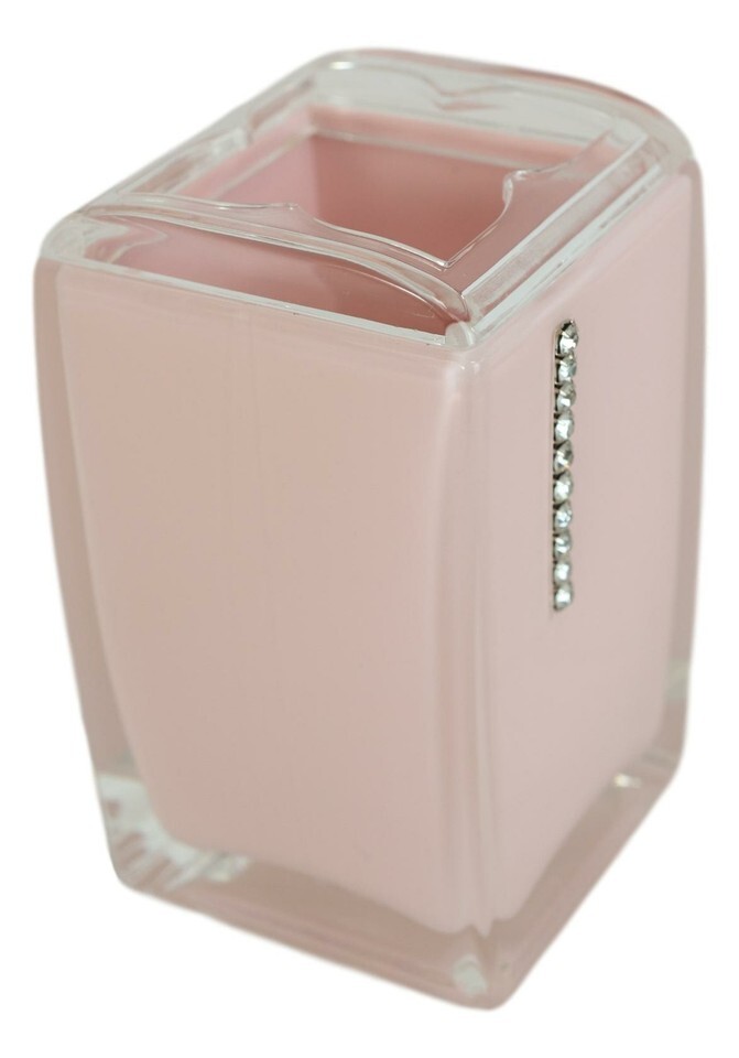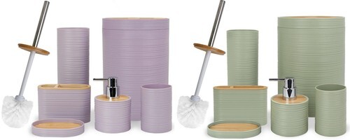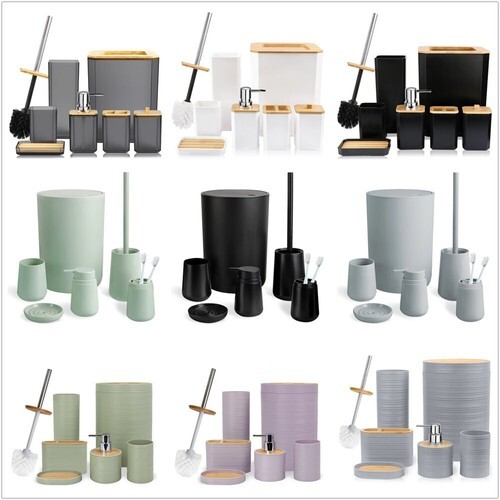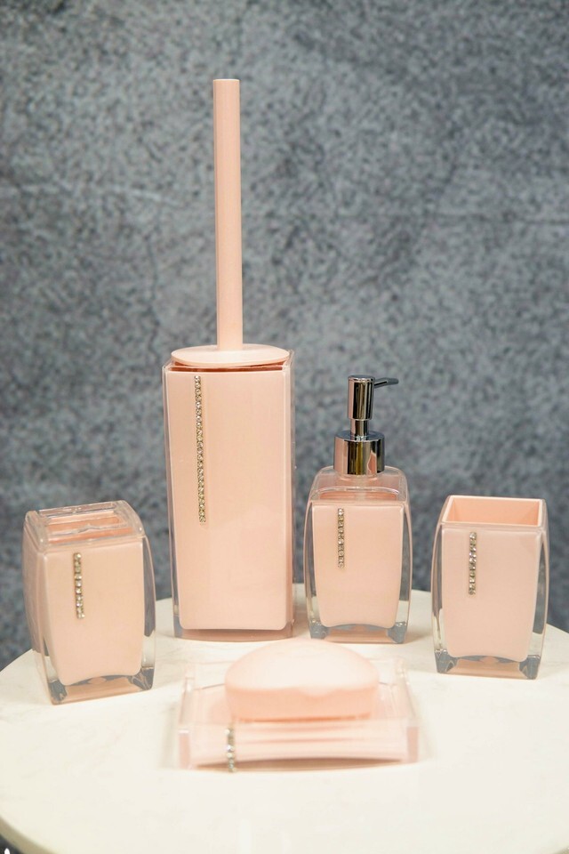 ? This classy and chic stylish decorative bathroom 6 piece gift set consists of a toilet brush and base, toothpaste and toothbrush holder, make up cosmetic tools holder, soap dish and hand sanitizer/soap pump dispenser all matching in design.
