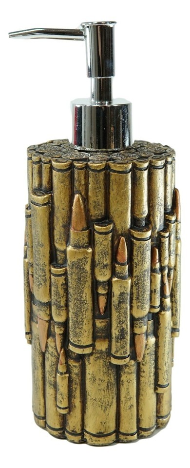 ? Add a touch of grit to your decor with this rifle ammo bullets bathroom accent accessory. Painted in gold tone, we align these sculptural bullets to form Liquid Soap Pump Dispenser, Tumbler Cup, Soap Dish and Toothbrush Holder sculptures.