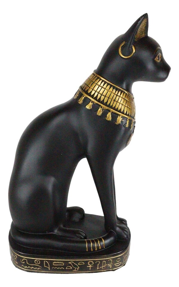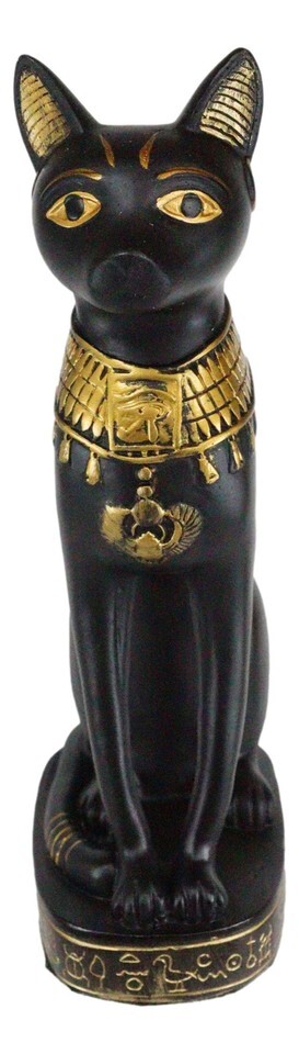 ? This Beautiful Bastet Cat Sculpture is made of designer composite resin, hand painted and polished individually. Color tone may vary from pictures. This classical black and gold Bastet sits atop a hieroglyphic-etched base, in a majestic stoical posture.
