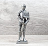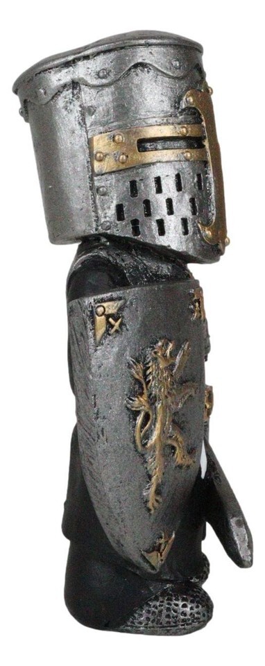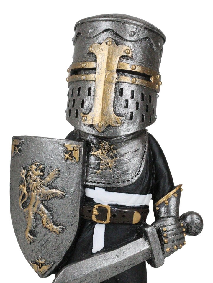 ? The Knight at Guard Mini Statue shows a mini knight ready for guard duty. The swordsman wears a black and white Crusader tunic, a great helm, and a baldric. A sword sits in the baldric, ready to be used. The helm is silver and gold toned, matching the shield. A rampant lion decorates the central crest of the shield in addition to a cross and corner brackets.