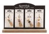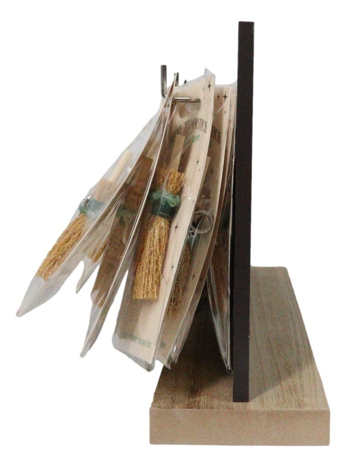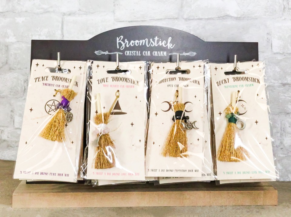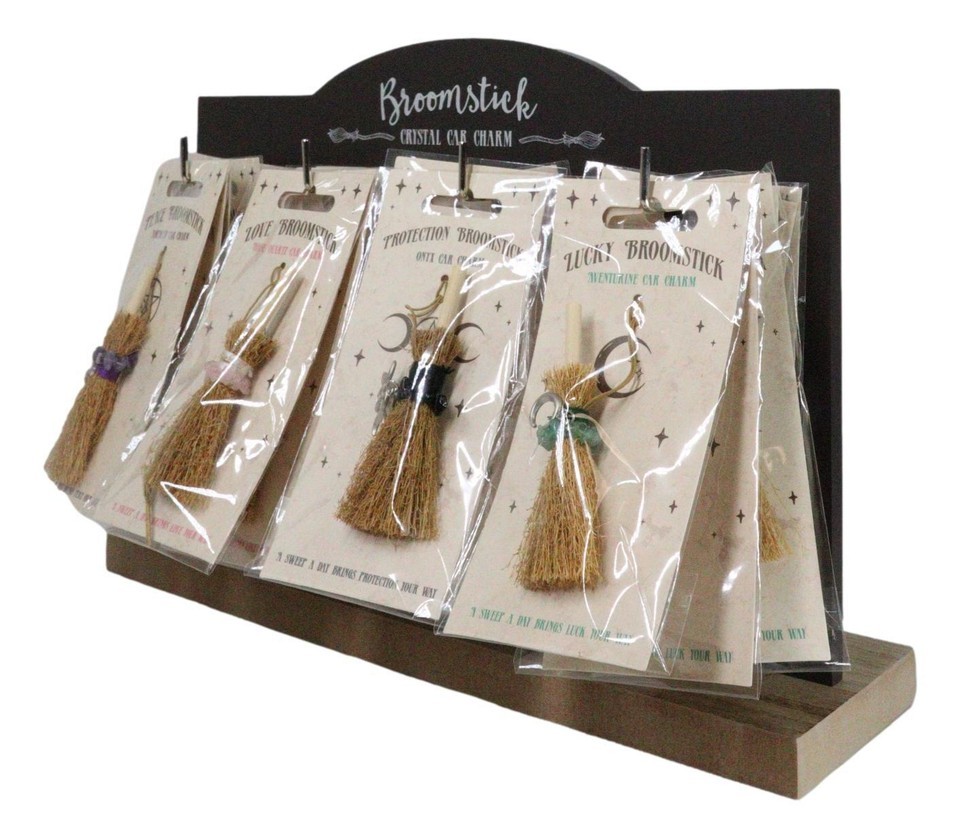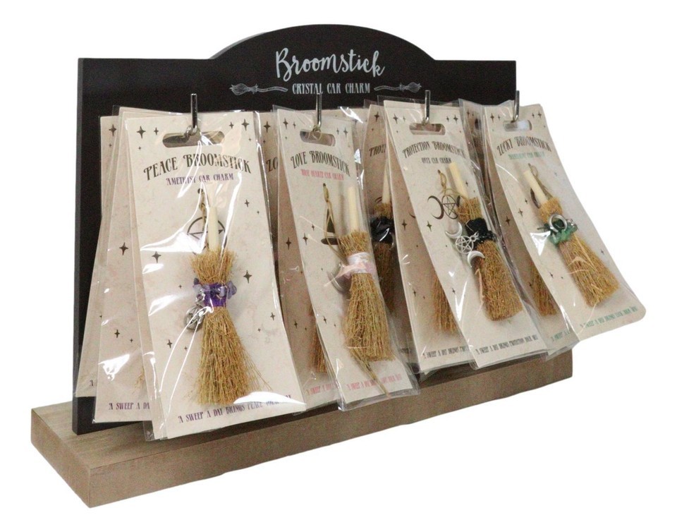 ? This display of lucky crystal broomstick car charms feature 4 magickal designs perfect for attracting luck, peace, protection and love. The charm designs include a crescent moon with green aventurine crystal chips, a pentagram with amethyst crystal chips, a triple moon with black onyx crystal chips, and a witch hat with rose quartz crystal chips. Sold as a set of 24 with 6 of each design on a matching mdf countertop display.