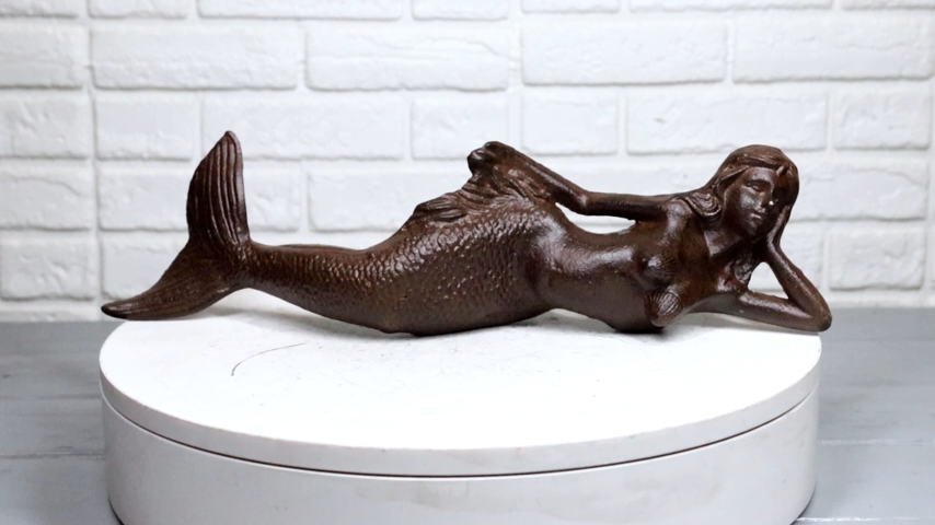 ? This Beautiful Nautical Ocean Mermaid Sculpture is made of solid cast iron, hand painted and polished individually with aged vintage bronze finish. Color tone may vary slightly from pictures.