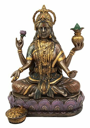 ? This beautiful figurine of the Goddess Lakshmi is an awesome reproduction of art on resin medium. She is beautifully adorned with jewelry and a luxurious crown. Lakshmi is seen as exceptionally beautiful, meditating on a lotus with four hands. Her hands hold lotus flowers, coins/fortune, and the lower left held in the mudra or posture of benediction or blessings.