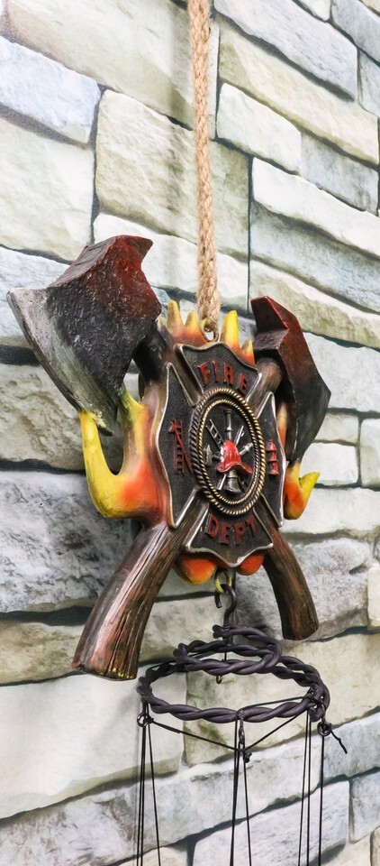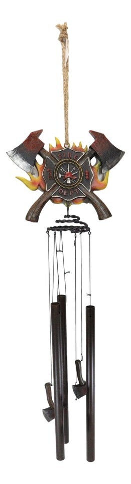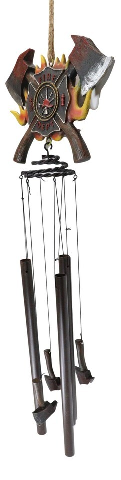 ? This particular wind chime features a heroic Maltese Cross crest with crossed axes and blazing fire at the backdrop. Attached to the sculptural crown are aluminum rods as well as mini ornaments of hand shovel tool and axes. This large sized wind chime is a perfect all in one gift for your hero!