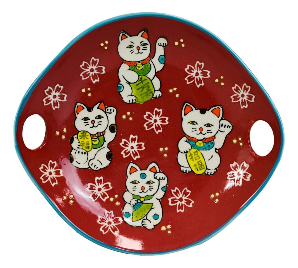 Ebros Red Maneki Neko Lucky Cats Appetizer Coupe Plate Flat Bowl With Chopsticks Set