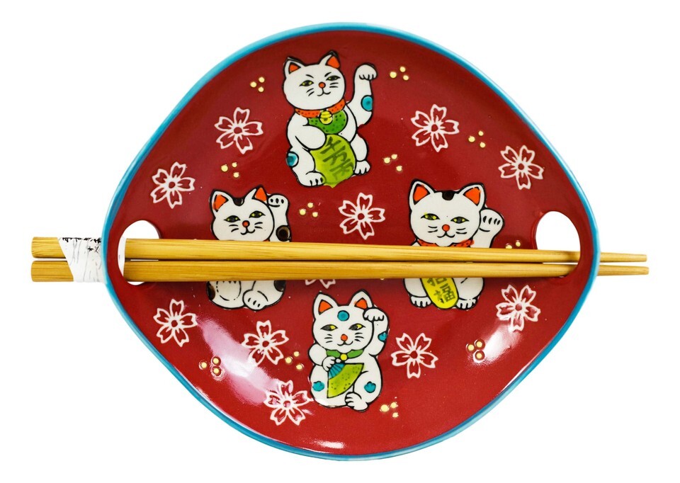 Pack Of 2 Red Maneki Neko Lucky Cats Appetizer Coupe Plates With Chopsticks Set