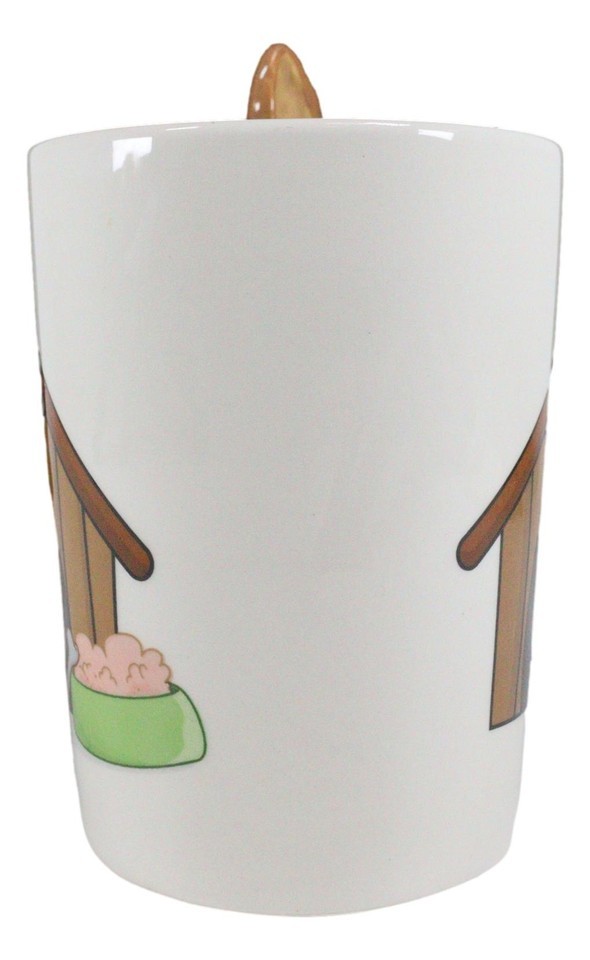 ? This french bulldog mug is double walled for higher durability, better handling and ease of cleaning. This whimsical mug features a french bulldog standing on its hind legs, forming the handle of the mug. The mug body has an image of a dog house, with a food bowl and treat bone. It is a delightful gift for any dog lover... especially those that have French Bulldogs.