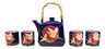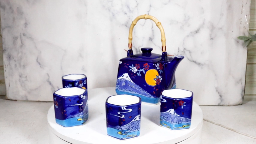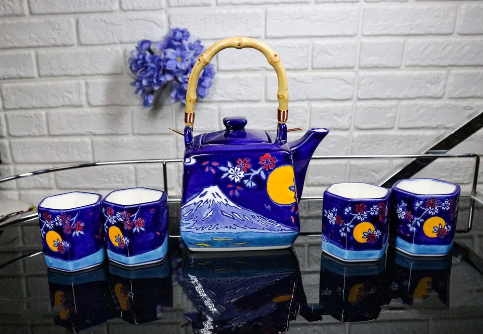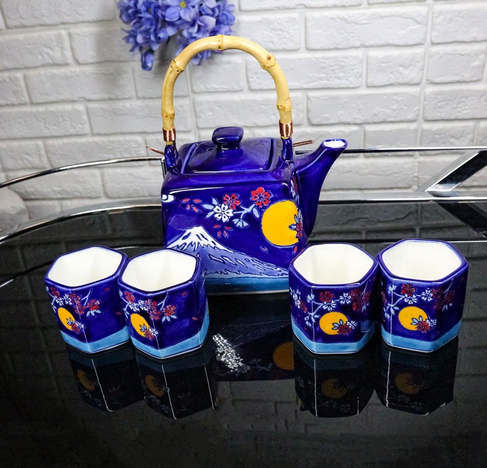 Blue Mount Fuji With Full Moon Ceramic Hexagonal Teapot With 4 Tea Cups Set