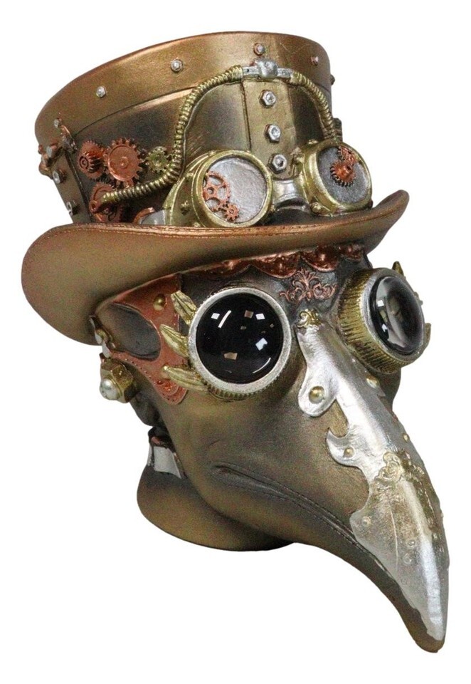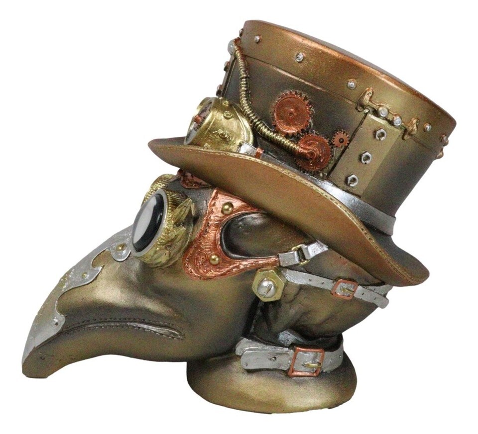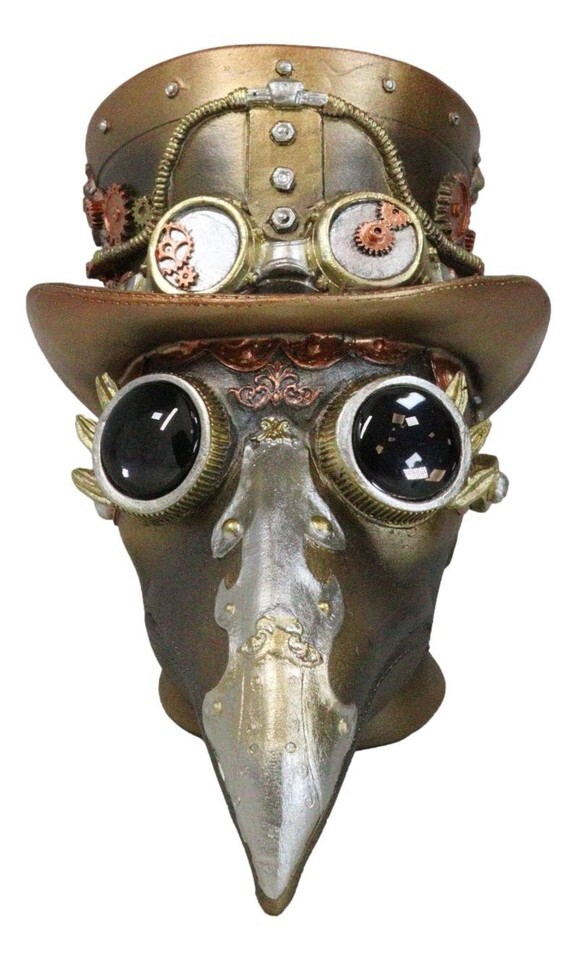 ? The plague doctor getup developed in the 17th century has been revamped into a military-inspired style for this bizarre gizmo for your home. The bird like beak, geared and piped hat, unique aviator goggles and other clockwork features of the sculpture make this Plaque Doctor skull an extremely cool collectible. This highly detailed piece of steampunk home decor makes an excellent gift and is sure to be a conversation piece.