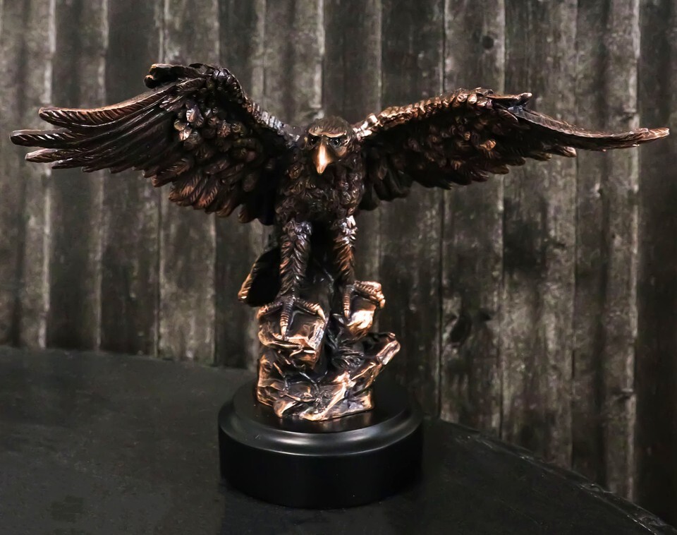 ? This beautiful Bald Eagle Statue is made of the highest quality resin, undergoing the process of bronze electroplating giving it a uniform shine on the inside as well as the surface of the figurine. This process makes the figurine resemble the look of actual bronze but with much lesser weight.This figurine is designed with a matching base to beautifully decorate your office, home and space.