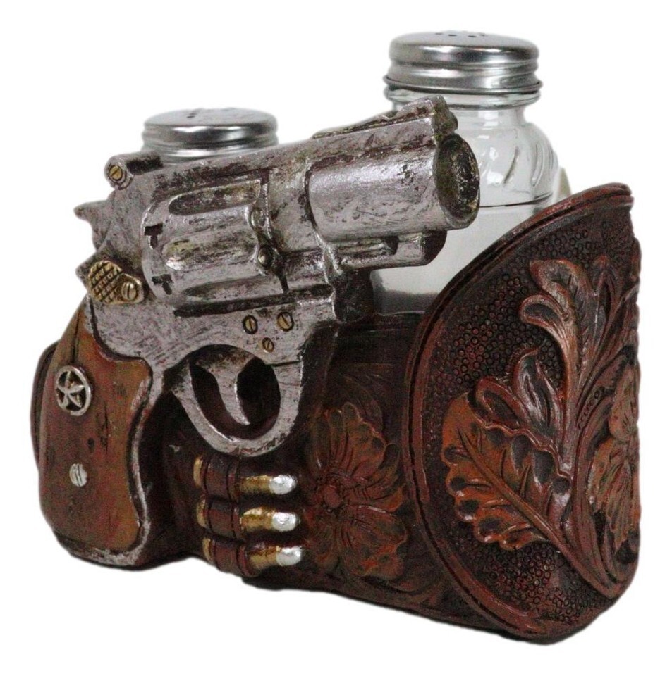 ? This Western Pistol With Holster Sculpture is a true frontier-inspired masterpiece for your dining table! Crafted with intricate detail and rugged charm, this pistol with holster and western star will transport you to the heart of the Wild West with every meal. Not only are they a captivating addition to your tabletop, but they also come with a stylish holder that keeps your salt and pepper shakers organized and within reach.