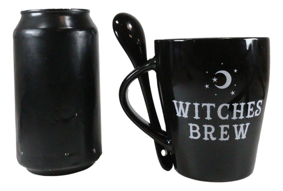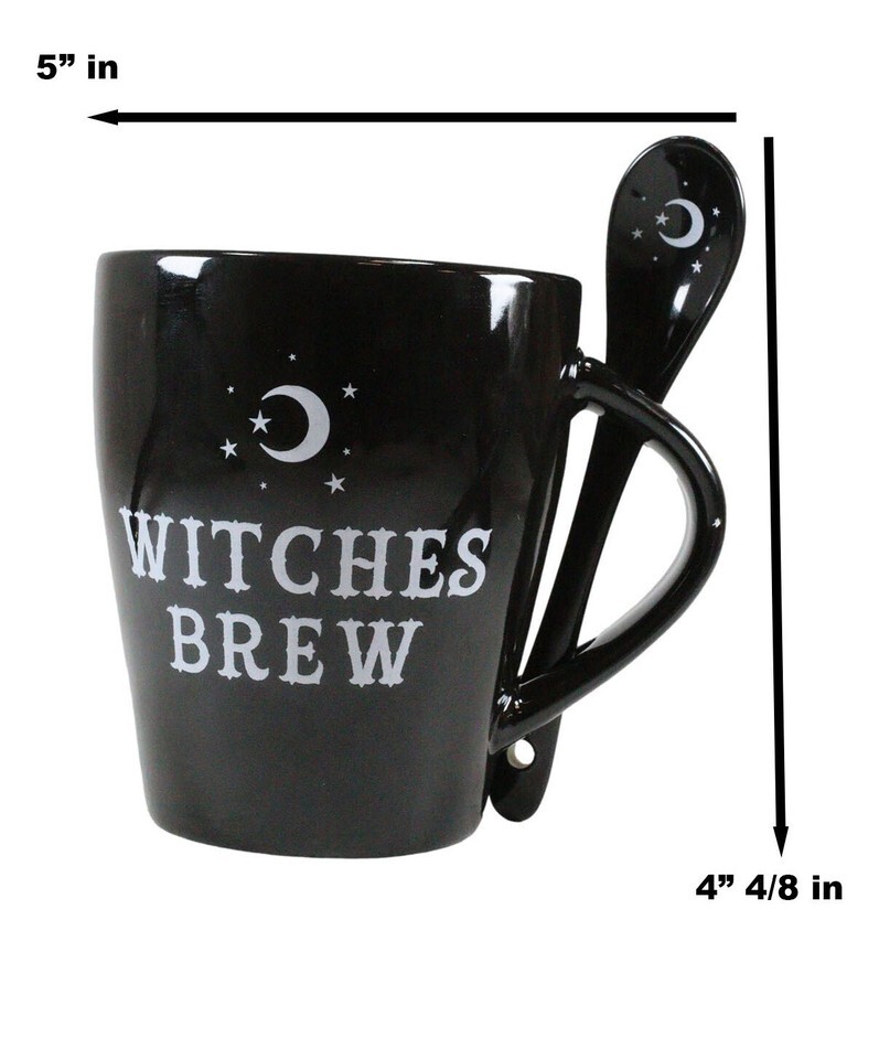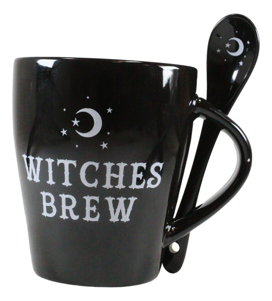 ? This enchanting mug and spoon set will add a touch of magic to any cup of coffee/tea/drink. The mug features the words 'Witches Brew' and has a matching teaspoon with a mystical crescent moon design surrounded by stars, which fits perfectly into the built in slotted handle.
