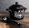 ? A stunning lidded bowl and spoon set featuring a black cat silhouette and moon design and the words 'Feline Hungry'.