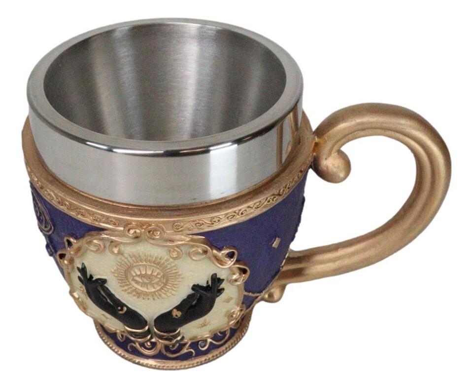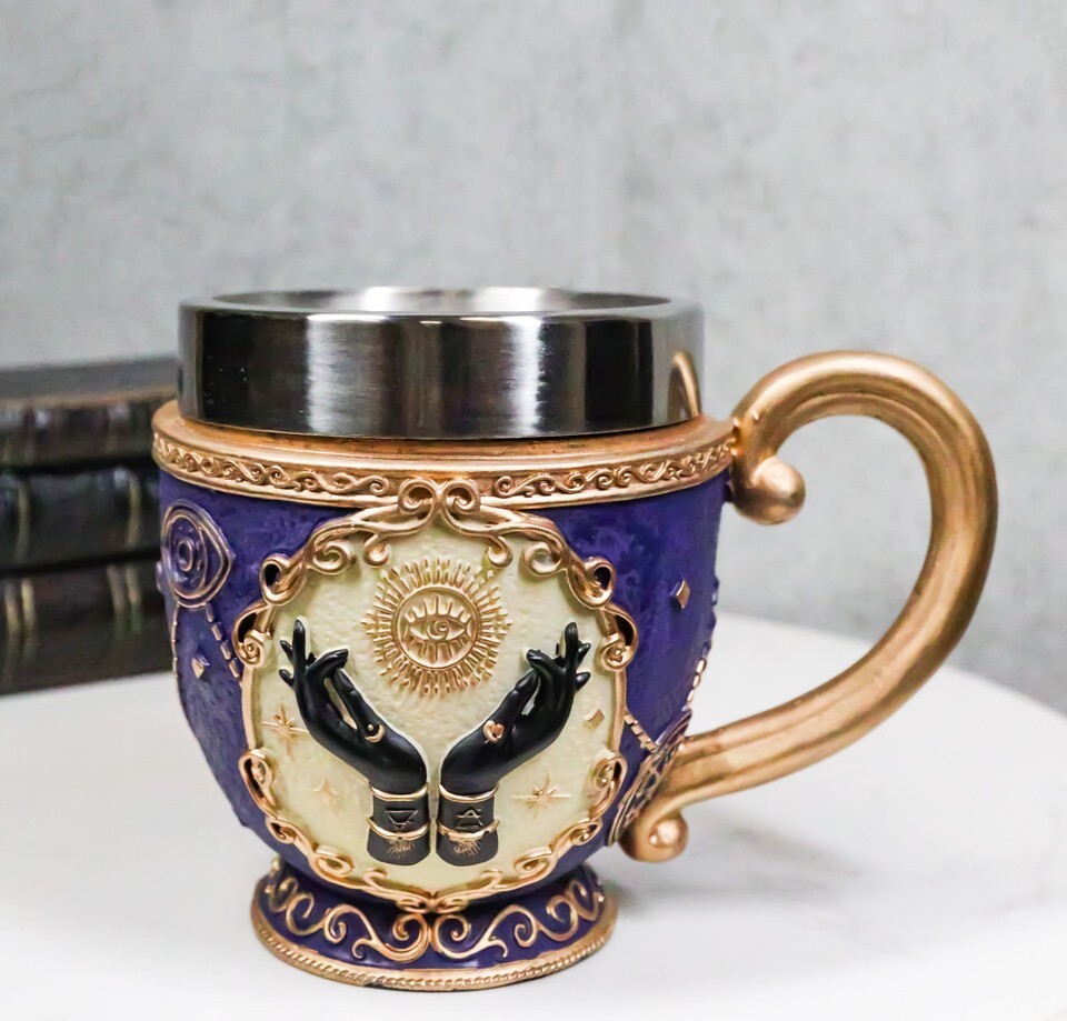 ? Perhaps if you read the tea leaves, you'll glimpse what future might await you! This lovely little teacup features a tarot-themed motif, with a pair of hands and various occult symbols - eyes and suns, stars and swirls. The stainless steel insert holds your drink of choice, and an curving golden handle completes the look.