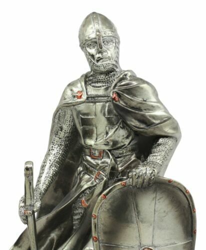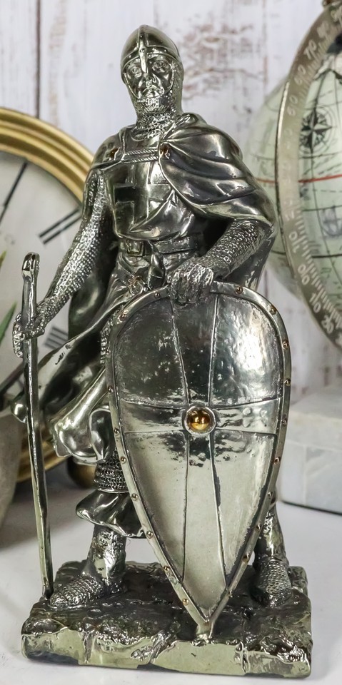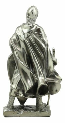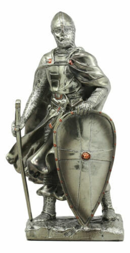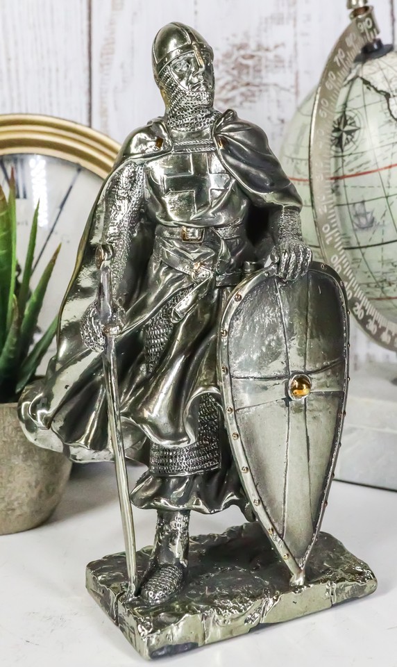 ? This Holy Roman Empire Crusader Knight Statue is made of silver electroplated polyresin, handpainted and polished individually.