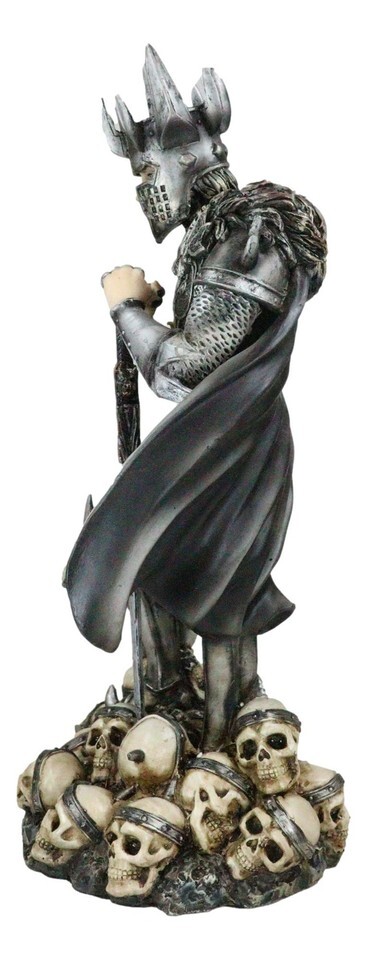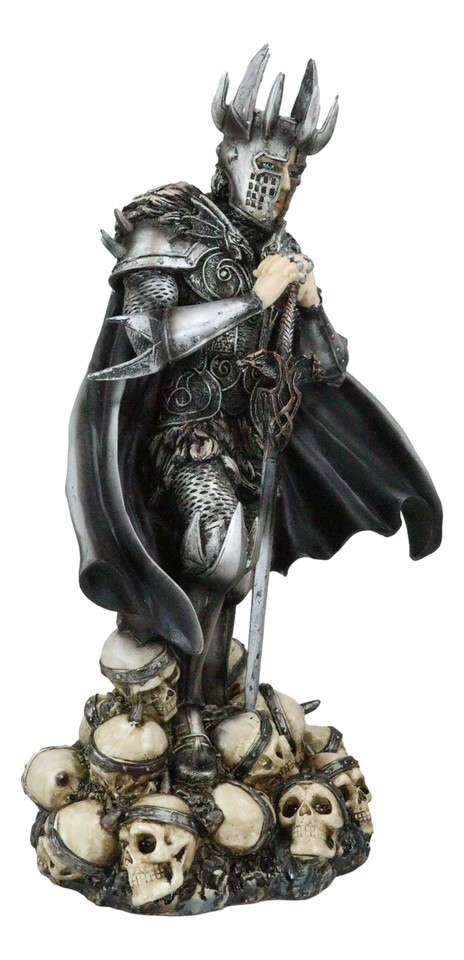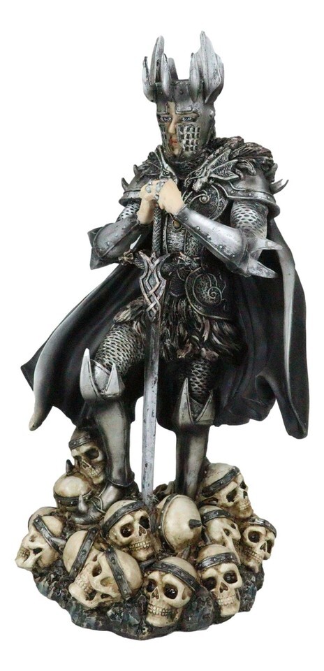 ? Not all knights fight for the light, saving damsels and upholding honor. This particular knight may have a bit of a shadier past than that. The warrior stands with sword in front of him, his armor shining and cloak billowing around him. Under his feet are the heads of his slain enemies. The skulls all wear circlets, suggesting that they were once people of importance... but no more.