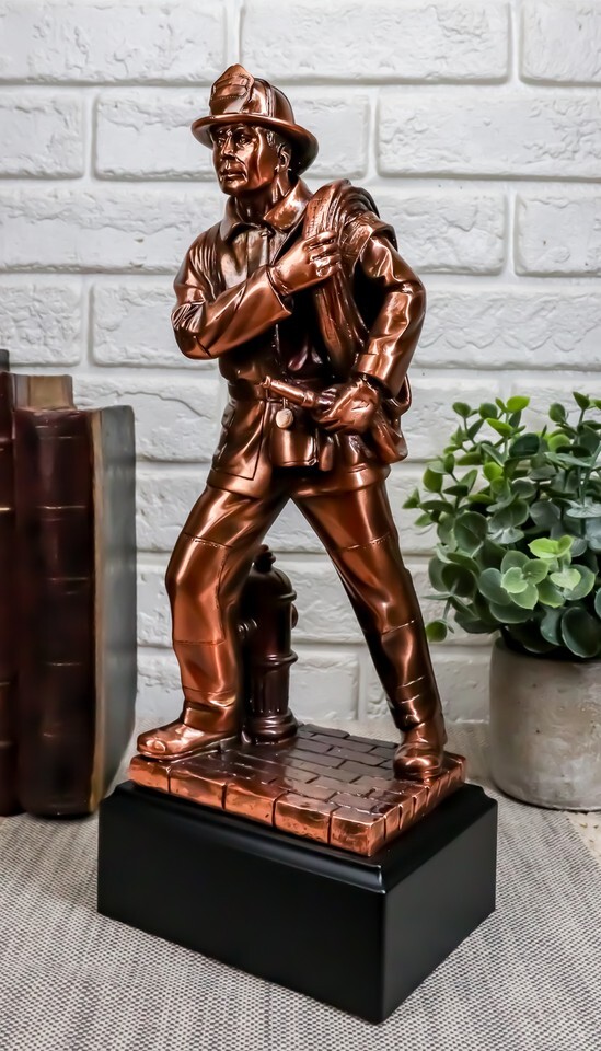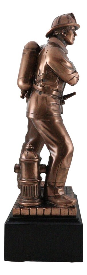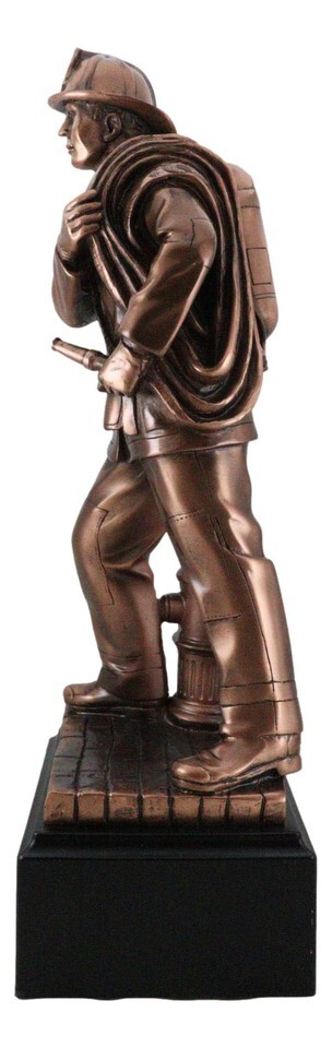 ? This Detailed Fireman Figurine is made of the highest quality resin, undergoing the process of bronze electroplating giving it a uniform shine on the inside as well as the surface of the figurine. This process makes the figurine resemble the look of actual bronze but with much lesser weight. To add sculptural aesthetics and display worthiness, we add accent black plastic bases to the sculptures.