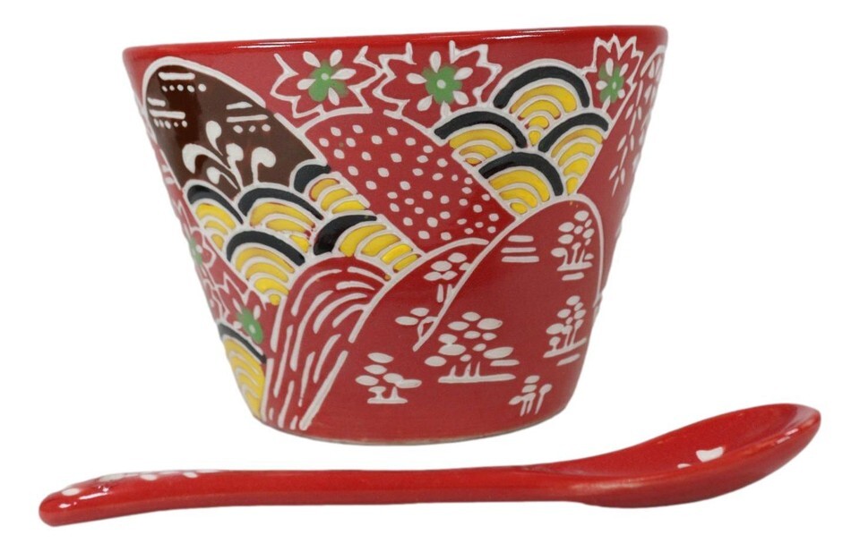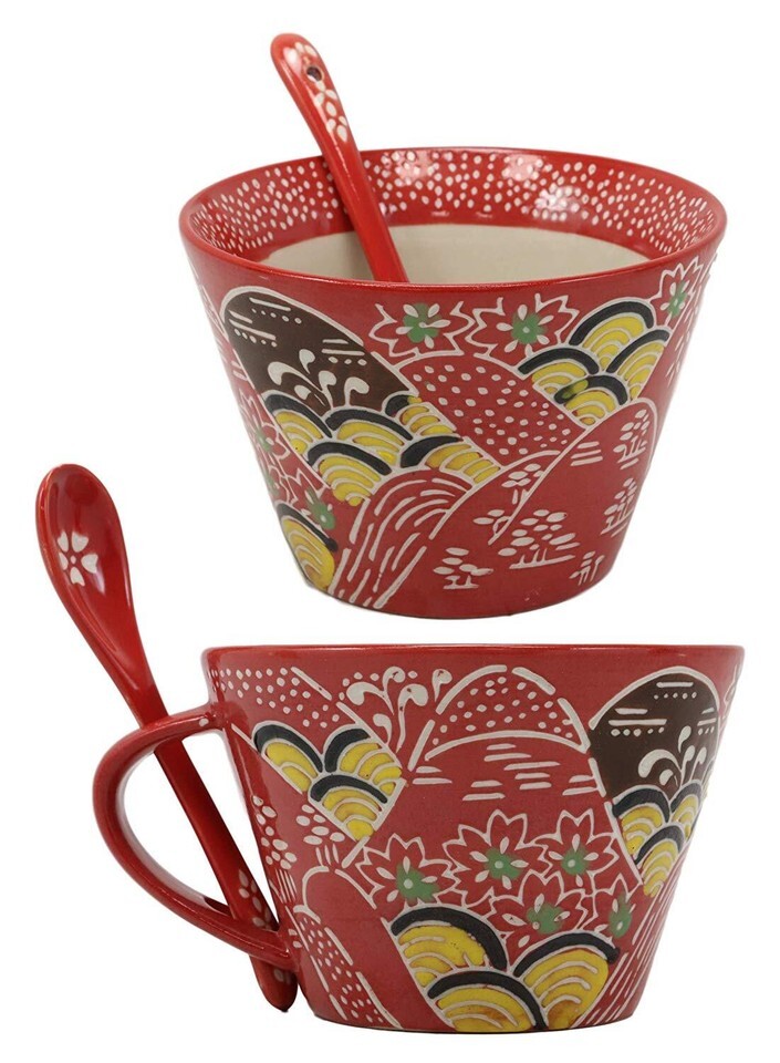 ? This particular design selection features beautiful mountain ranges with floral decorations all around them. We add splashes of yellow, white, brown and green to a pallete of red. The mug is flared at the top and the mug handle features a convenient spoon storage niche. The mug is double walled for better heat insulation as well as comfort during handling.