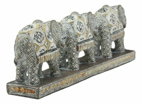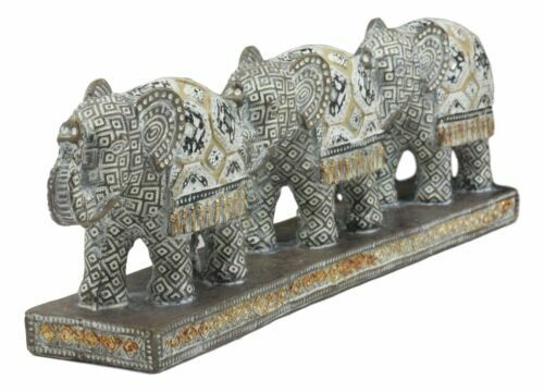 ? This sculpture features three beautifully decorated elephants with their trunks up lined up head to tail on a rectangular decor base. The body of each elephant features stylish contemporary geometric patterns and on its back lies a painted blanket made to look like ancient tapestry. Their ears are decorated with the round circle like patterns in contrast to the straight edged patters found everywhere else on the body.