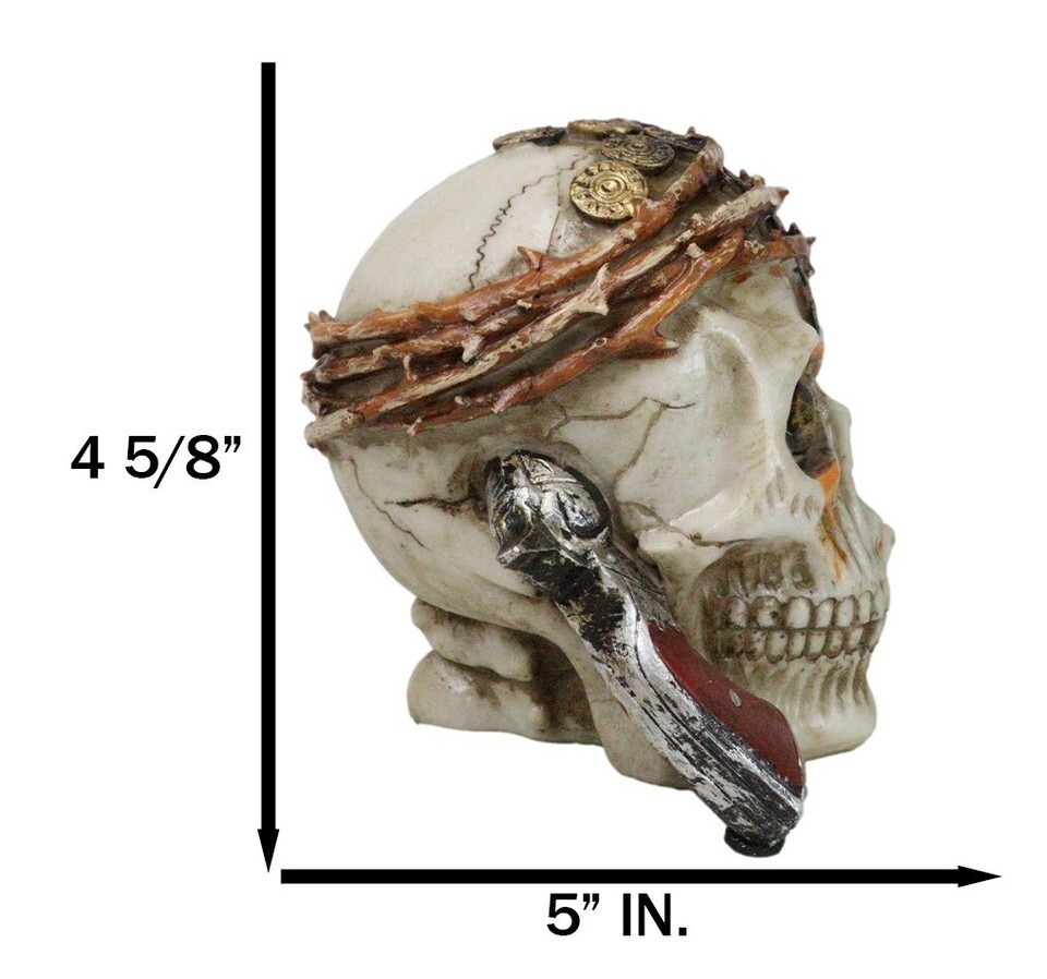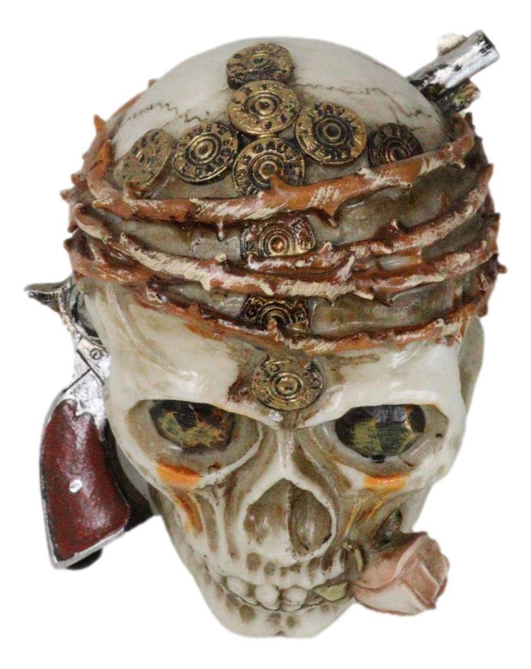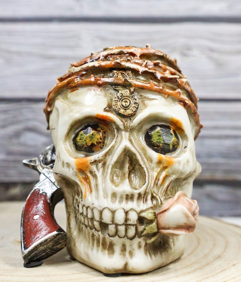 ? Embrace the fierce and rebellious spirit of the high seas with the Pirate Captain Marauder Skull Figurine. This captivating piece features a menacing skull adorned with a twisted vine, thorny crown, symbolizing the rugged life of a pirate. A revolver is dramatically stuck into the skull's head, while the skull defiantly bites down on a pink rose, adding a touch of dark romance to the design.