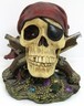 ? This Pirate Skull figurine measures 4.5" tall, 5" long and 4.25" deep approximately. It weighs about 1 pound.