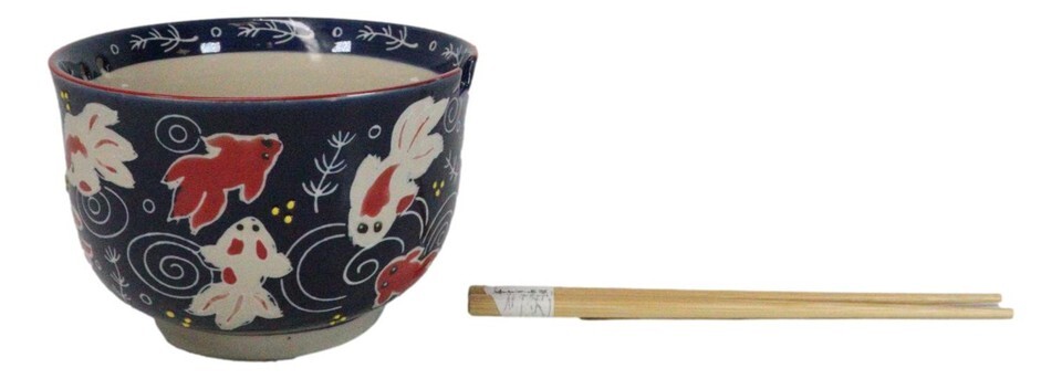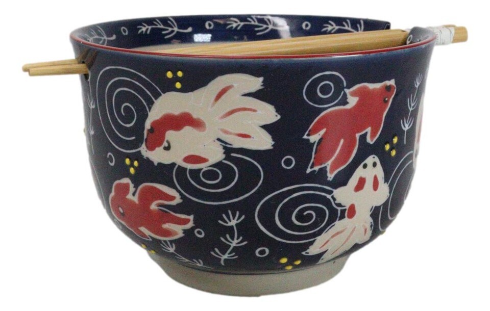 Red White Japanese Goldfishes Large 24Oz Donburi Ramen Bowl With Chopsticks Set